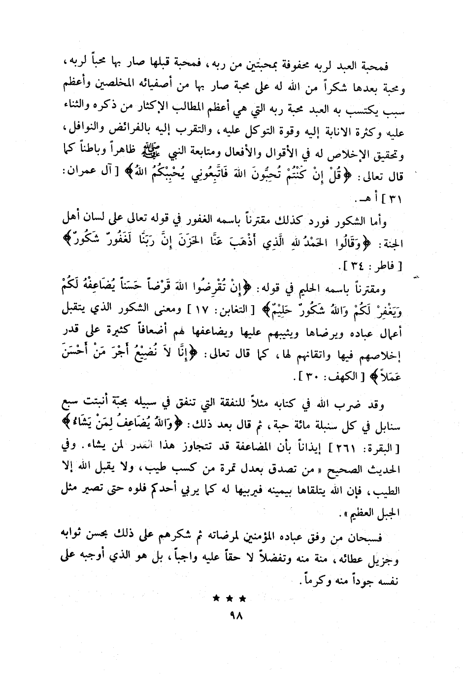 و قد ضرب اللّه في كتابه مثلا للنفقة التي تنفق في سبيله بحبّة أنبت سبع سنابل في كل سنبلة مائة حبة، ثم قال بعد ذلك: واللَّهُ يُضاعِفُ لِمَنْ يَشاءُ [البقرة: 261] إيذانا بأن المضاعفة قد تتجاوز هذا القدر لمن يشاء. وفي الحديث الصحيح «من تصدق بعدل تمرة من كسب طيب، ولا يقبل اللّه إلا الطيب، فإن اللّه يتلقاها بيمينه فيربيها له كما يربي أحدكم فلوه حتى تصير مثل الجبل العظيم».