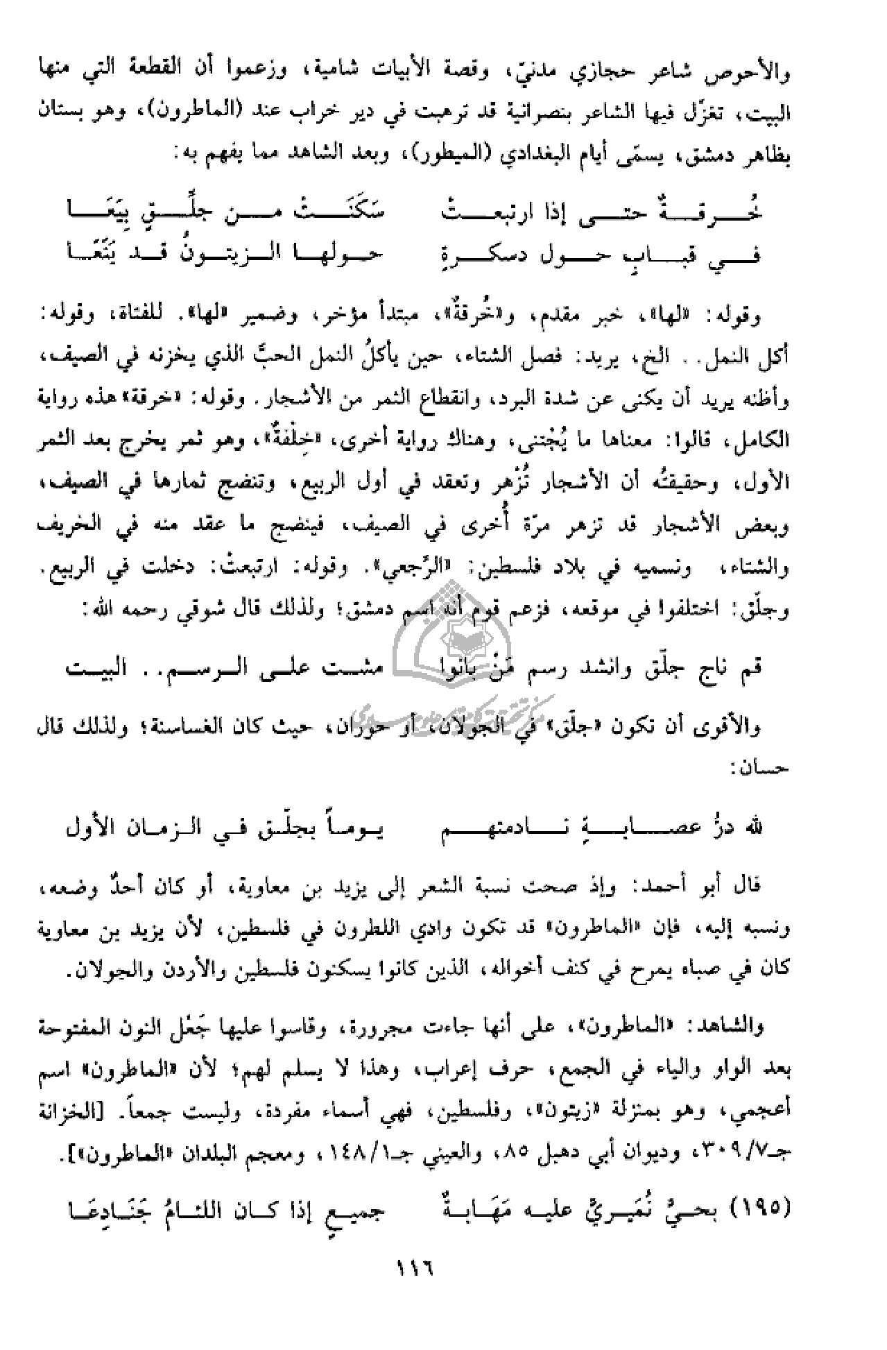 والشاهد: «الماطرون»، على أنها جاءت مجرورة، وقاسوا عليها جعل النون المفتوحة بعد الواو والياء في الجمع، حرف إعراب، وهذا لا يسلم لهم؛ لأن «الماطرون» اسم أعجمي، وهو بمنزلة «زيتون»، وفلسطين، فهي أسماء مفردة، وليست جمعا. [الخزانة ج 7/ 309، وديوان أبي دهبل 85، والعيني ج 1/ 148، ومعجم البلدان «الماطرون»].