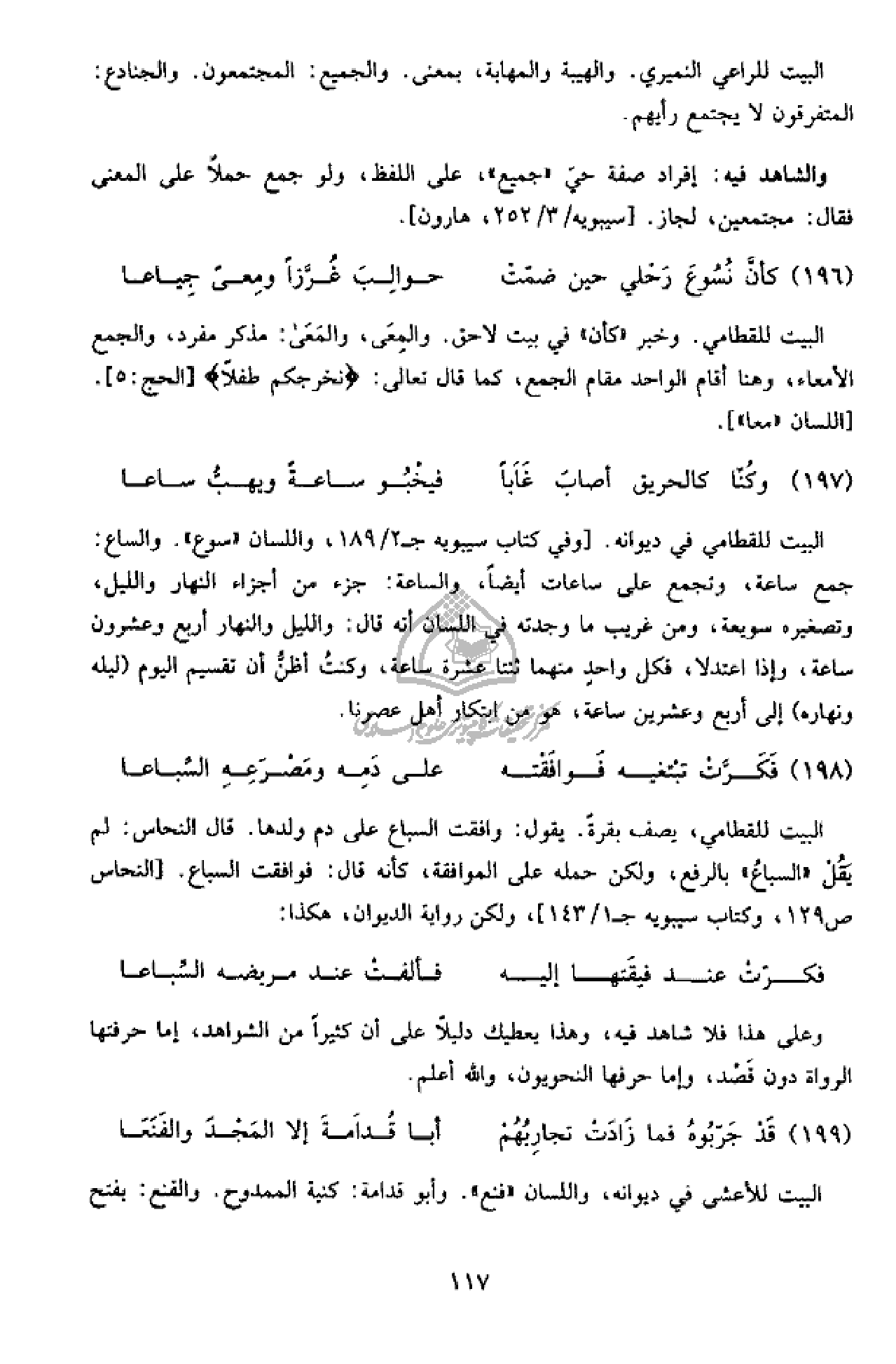 البيت للقطامي، يصف بقرة. يقول: وافقت السباع على دم ولدها. قال النحاس: لم يقل «السباع» بالرفع، ولكن حمله على الموافقة، كأنه قال: فوافقت السباع. [النحاس ص 129، وكتاب سيبويه ج 1/ 143]، ولكن رواية الديوان، هكذا: