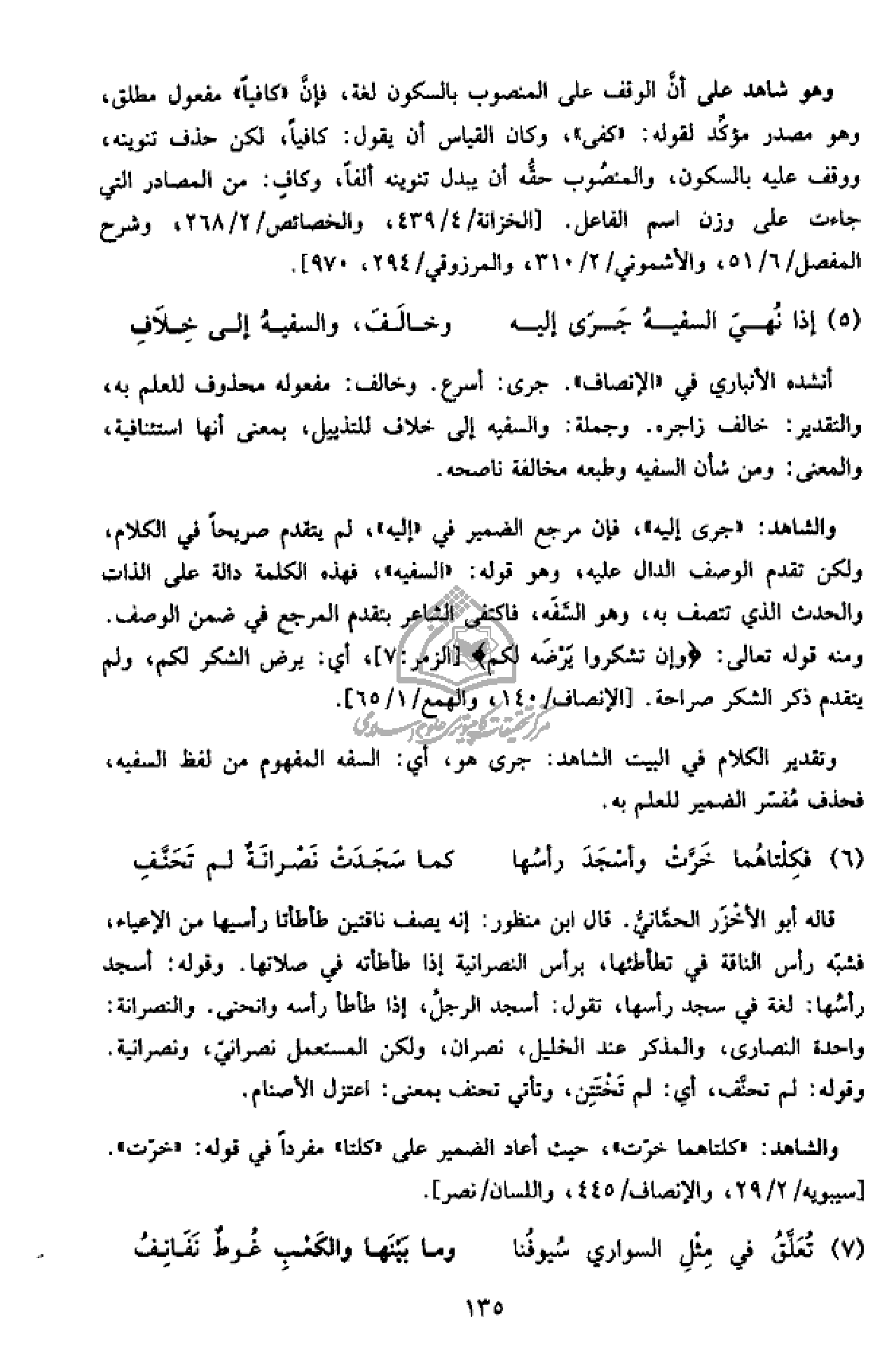 وهو شاهد على أنّ الوقف على المنصوب بالسكون لغة، فإنّ «كافيا» مفعول مطلق، وهو مصدر مؤكّد لقوله: «كفى»، وكان القياس أن يقول: كافيا، لكن حذف تنوينه، ووقف عليه بالسكون، والمنصوب حقّه أن يبدل تنوينه ألفا، وكاف: من المصادر التي جاءت على وزن اسم الفاعل. [الخزانة/ 4/ 439، والخصائص/ 2/ 268، وشرح المفصل/ 6/ 51، والأشموني/ 2/ 310، والمرزوقي/ 294، 970].
