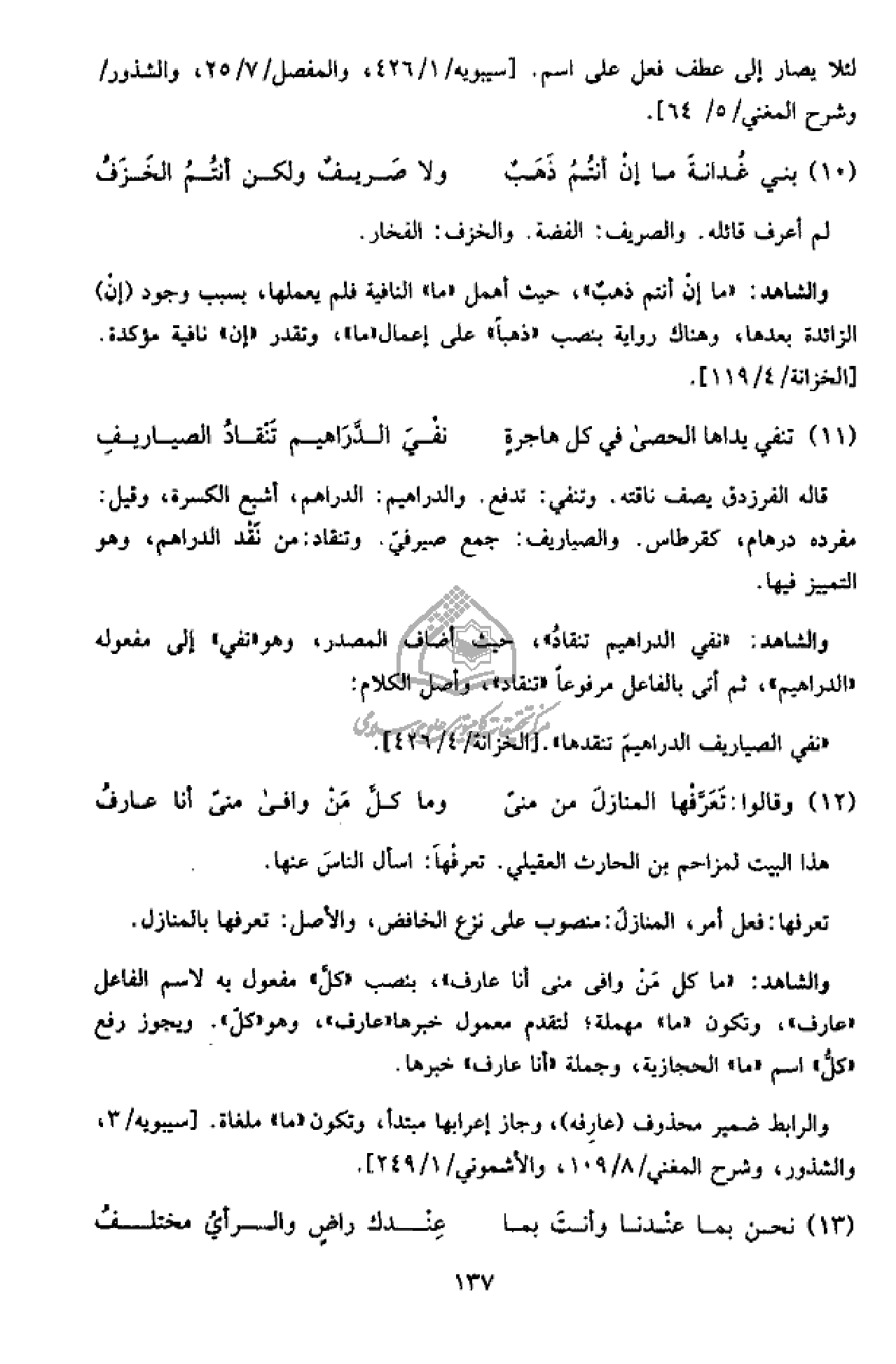 والشاهد: «ما إن أنتم ذهب»، حيث أهمل «ما» النافية فلم يعملها، بسبب وجود (إن) الزائدة بعدها، وهناك رواية بنصب «ذهبا» على إعمال «ما»، وتقدر «إن» نافية مؤكدة.