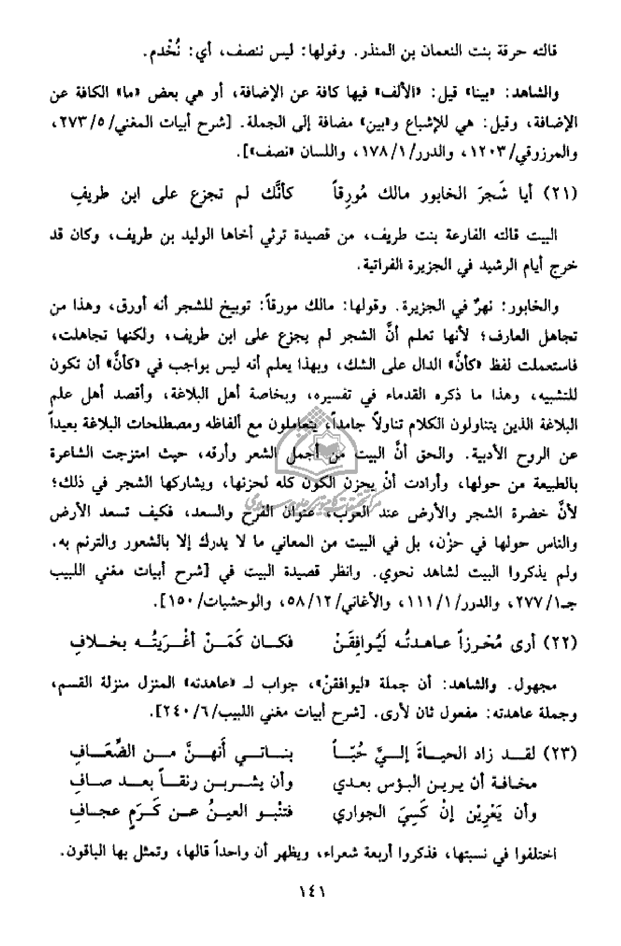والخابور: نهر في الجزيرة. وقولها: مالك مورقا: توبيخ للشجر أنه أورق، وهذا من تجاهل العارف؛ لأنها تعلم أنّ الشجر لم يجزع على ابن طريف، ولكنها تجاهلت، فاستعملت لفظ «كأنّ» الدال على الشك، وبهذا يعلم أنه ليس بواجب في «كأنّ» أن تكون للتشبيه، وهذا ما ذكره القدماء في تفسيره، وبخاصة أهل البلاغة، وأقصد أهل علم البلاغة الذين يتناولون الكلام تناولا جامدا، يتعاملون مع ألفاظه ومصطلحات البلاغة بعيدا عن الروح الأدبية. والحق أنّ البيت من أجمل الشعر وأرقه، حيث امتزجت الشاعرة بالطبيعة من حولها، وأرادت أن يحزن الكون كله لحزنها، ويشاركها الشجر في ذلك؛ لأنّ خضرة الشجر والأرض عند العرب، عنوان الفرح والسعد، فكيف تسعد الأرض والناس حولها في حزن، بل في البيت من المعاني ما لا يدرك إلا بالشعور والترنم به.