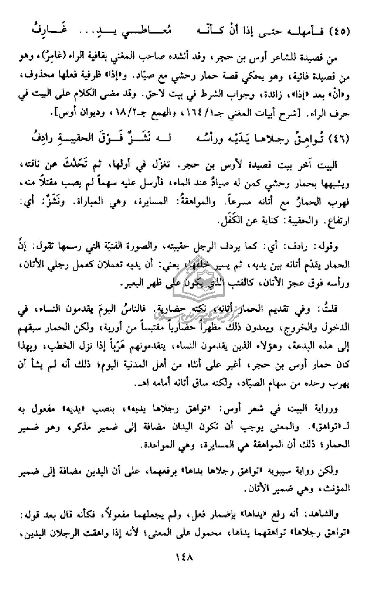 ولكن رواية سيبويه «تواهق رجلاها يداها» برفعهما، على أن اليدين مضافة إلى ضمير المؤنث، وهي ضمير الأتان.