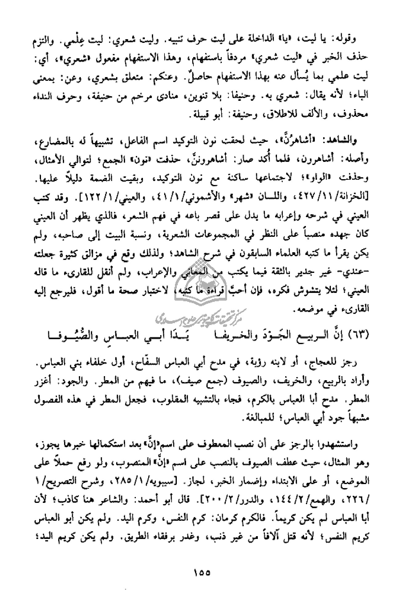 واستشهدوا بالرجز على أن نصب المعطوف على اسم «إنّ» بعد استكمالها خبرها يجوز، وهو المثال، حيث عطف الصيوف بالنصب على اسم «إنّ» المنصوب، ولو رفع حملا على الموضع، أو على الابتداء وإضمار الخبر، لجاز. [سيبويه/ 1/ 285، وشرح التصريح/ 1/ 226، والهمع/ 2/ 144، والدرر/ 2/ 200]. قال أبو أحمد: والشاعر هنا كاذب؛ لأن أبا العباس لم يكن كريما. فالكرم كرمان: كرم النفس، وكرم اليد. ولم يكن أبو العباس كريم النفس؛ لأنه قتل آلافا من غير ذنب، وغدر برفقاء الطريق. ولم يكن كريم اليد؛