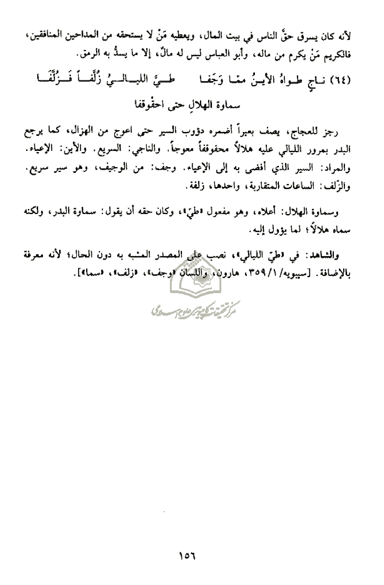 والشاهد: في «طيّ الليالي»، نصب على المصدر المشبه به دون الحال؛ لأنه معرفة بالإضافة. [سيبويه/ 1/ 359، هارون، واللسان «وجف»، «زلف»، «سما»].
