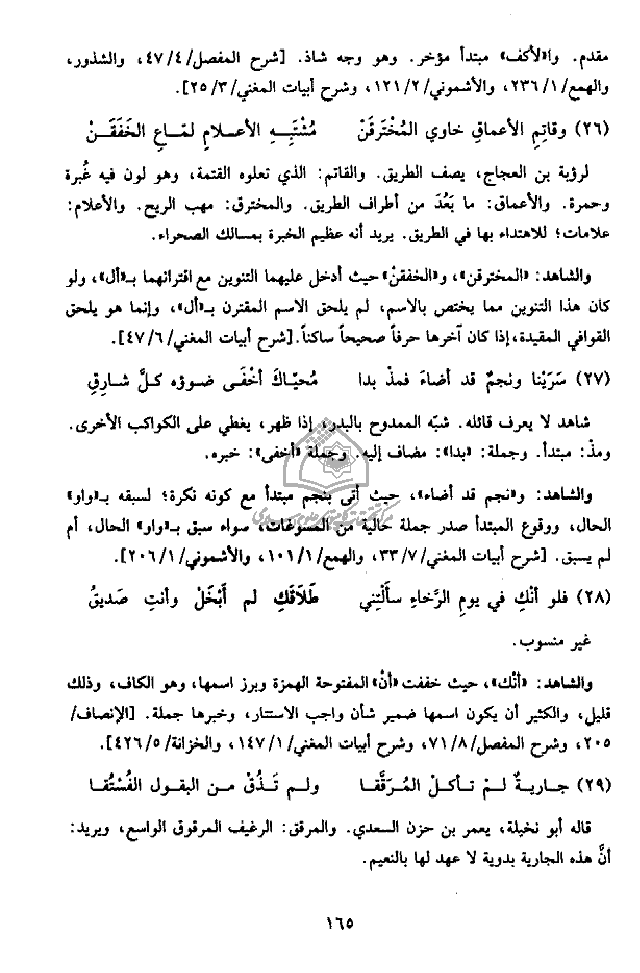 والشاهد: و «نجم قد أضاء»، حيث أتى بنجم مبتدأ مع كونه نكرة؛ لسبقه ب «واو» الحال، ووقوع المبتدأ صدر جملة حالية من المسوغات، سواء سبق ب «واو» الحال، أم لم يسبق. [شرح أبيات المغني/ 7/ 33، والهمع/ 1/ 101، والأشموني/ 1/ 206].