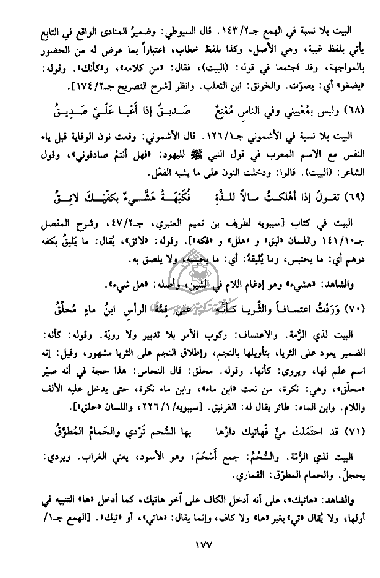 والشاهد: «هاتيك»، على أنه أدخل الكاف على آخر هاتيك، كما أدخل «ها» التنبيه في أولها، ولا يقال «تي» بغير «ها» ولا كاف، وإنما يقال: «هاتي»، أو «تيك». [الهمع ج 1 -