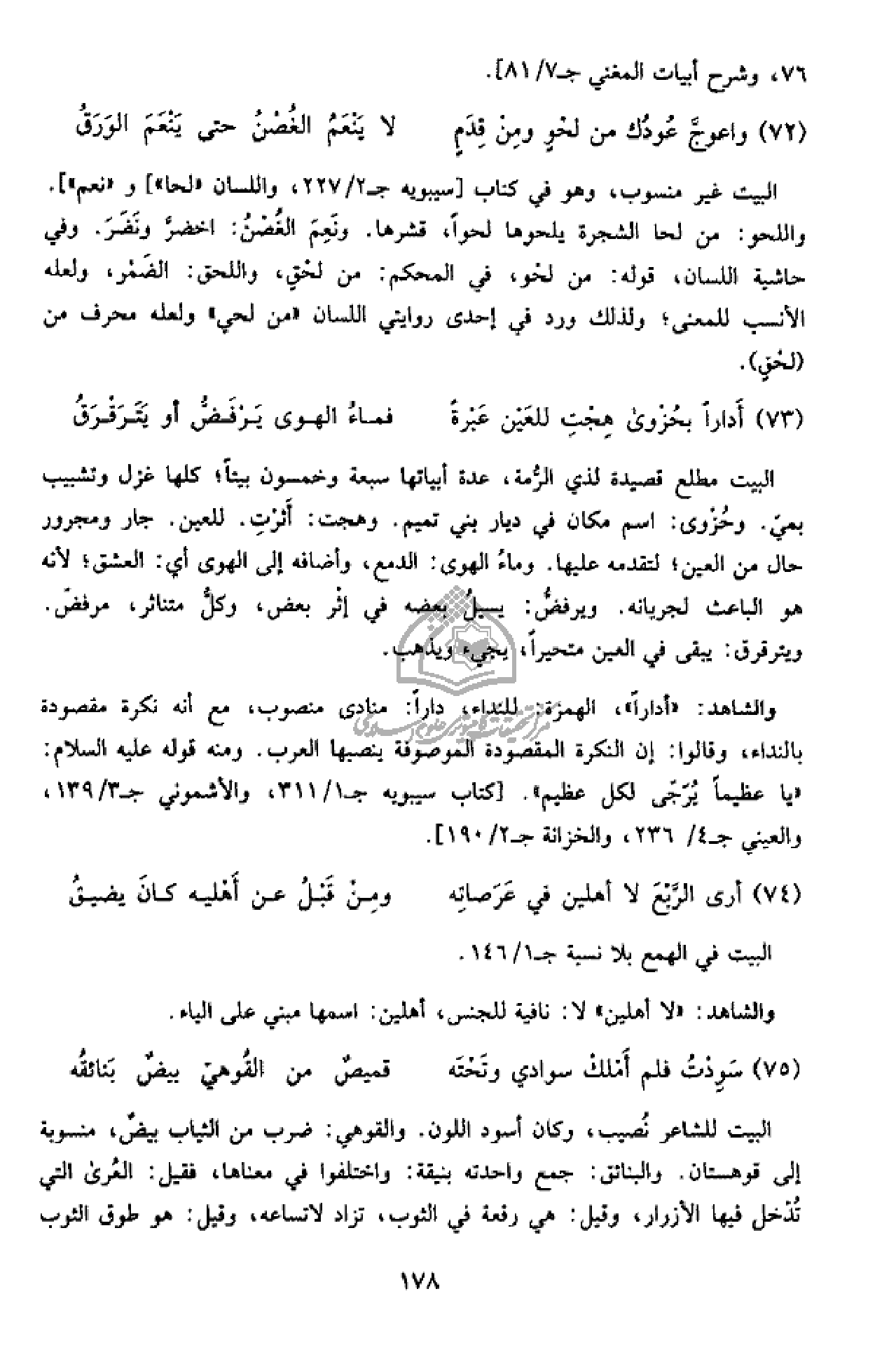 البيت مطلع قصيدة لذي الرّمة، عدة أبياتها سبعة وخمسون بيتا؛ كلها غزل وتشبيب بميّ. وحزوى: اسم مكان في ديار بني تميم. وهجت: أثرت. للعين. جار ومجرور حال من العين؛ لتقدمه عليها. وماء الهوى: الدمع، وأضافه إلى الهوى أي: العشق؛ لأنه هو الباعث لجريانه. ويرفضّ: يسيل بعضه في إثر بعض، وكلّ متناثر، مرفّض.