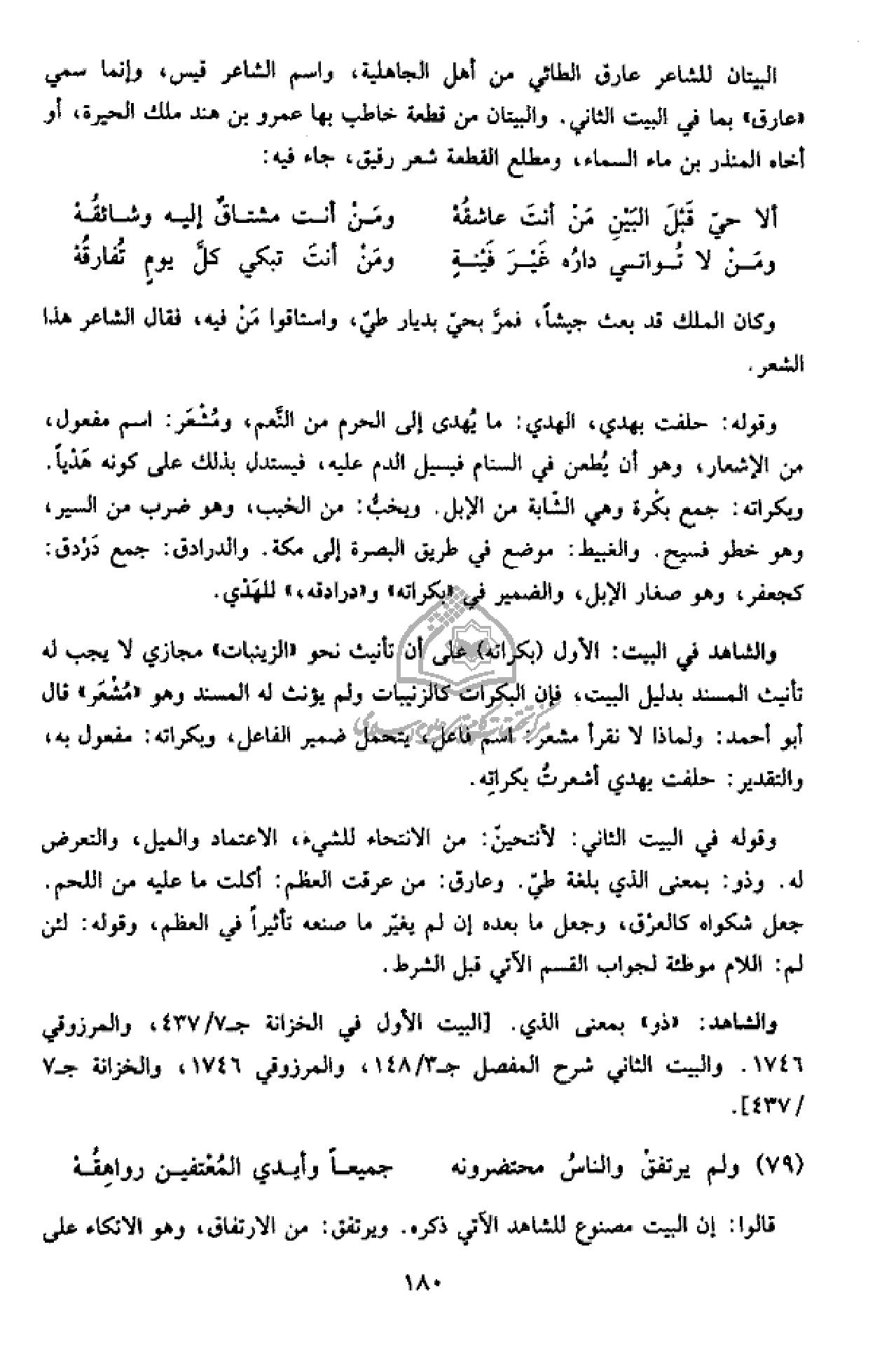 والشاهد في البيت: الأول (بكراته) على أن تأنيث نحو «الزينبات» مجازي لا يجب له تأنيث المسند بدليل البيت، فإن البكرات كالزنيبات ولم يؤنث له المسند وهو «مشعر» قال أبو أحمد: ولماذا لا نقرأ مشعر: اسم فاعل، يتحمل ضمير الفاعل، وبكراته: مفعول به، والتقدير: حلفت بهدي أشعرت بكراته.
