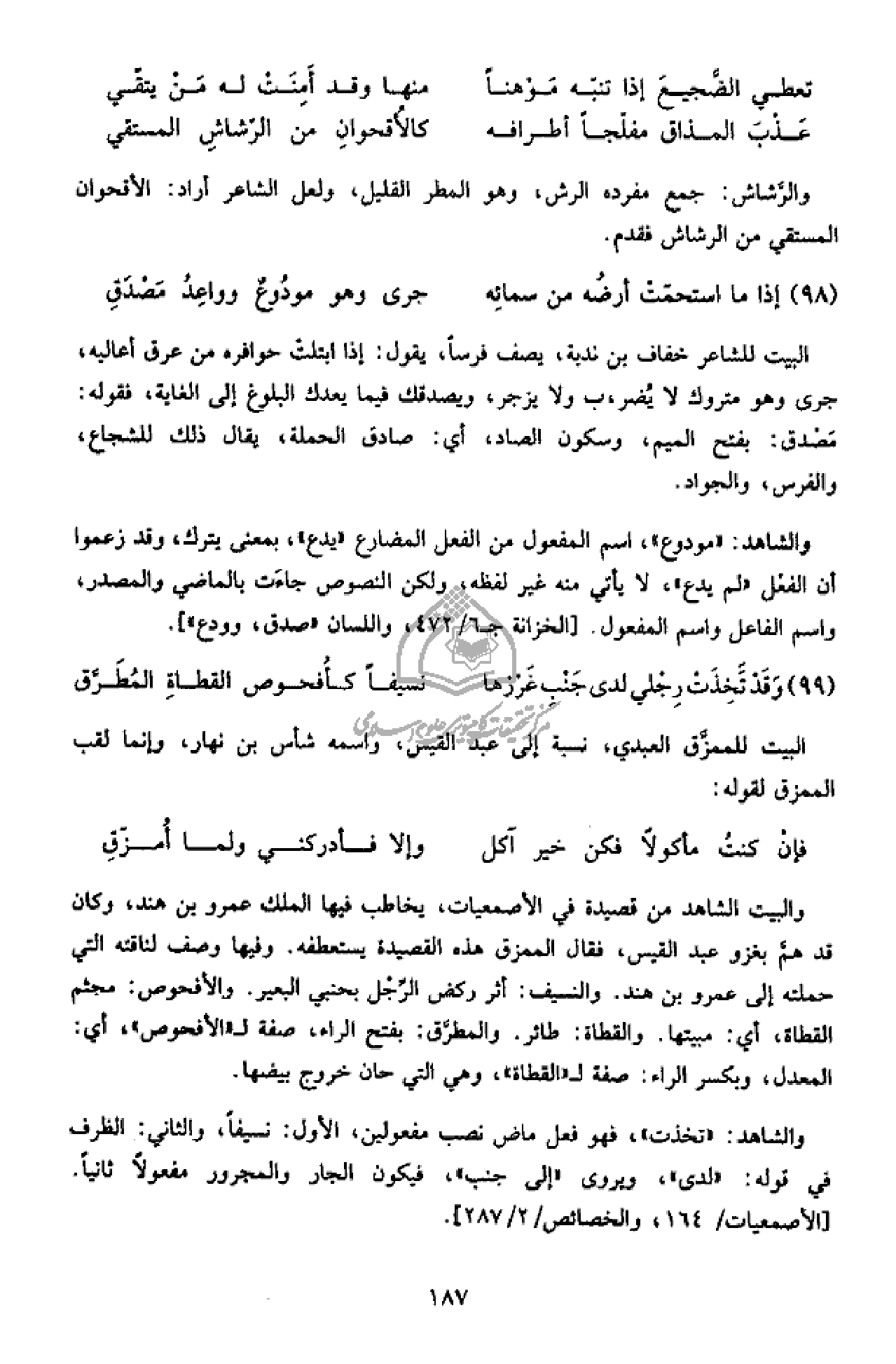 والبيت الشاهد من قصيدة في الأصمعيات، يخاطب فيها الملك عمرو بن هند، وكان قد همّ بغزو عبد القيس، فقال الممزق هذه القصيدة يستعطفه. وفيها وصف لناقته التي حملته إلى عمرو بن هند. والنسيف: أثر ركض الرّجل بحنبي البعير. والأفحوص: مجثم القطاة، أي: مبيتها. والقطاة: طائر. والمطرّق: بفتح الراء، صفة ل «الأفحوص»، أي: