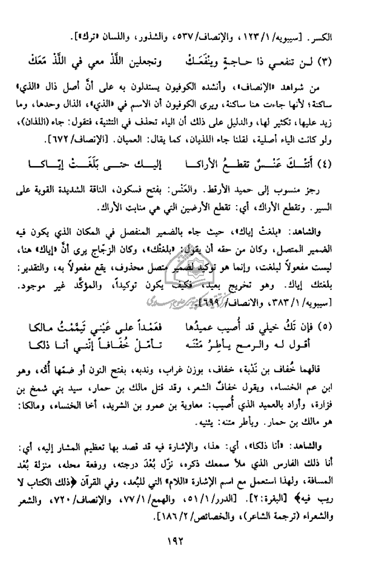 من شواهد «الإنصاف»، وأنشده الكوفيون يستدلون به على أنّ أصل ذال «الذي» ساكنة؛ لأنها جاءت هنا ساكنة، ويرى الكوفيون أن الاسم في «الذي»، الذال وحدها، وما زيد عليها، تكثير لها، والدليل على ذلك أن الياء تحذف في التثنية، فتقول: جاء (اللذان)، ولو كانت الياء أصلية، لقلنا جاء اللذيان، كما يقال: العميان. [الإنصاف/ 672].