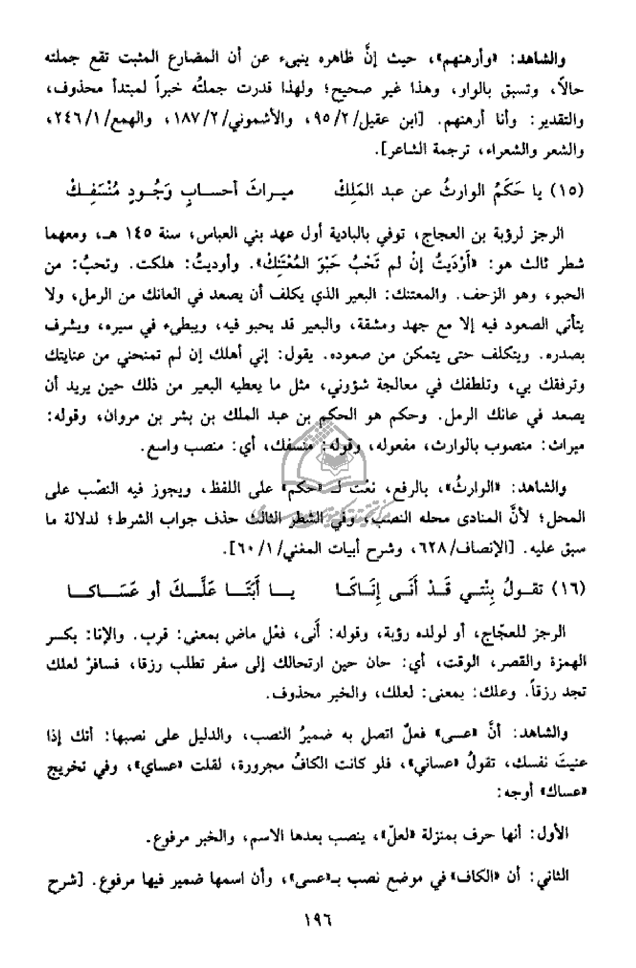 والشاهد: أنّ «عسى» فعل اتصل به ضمير النصب، والدليل على نصبها: أنك إذا عنيت نفسك، تقول «عساني»، فلو كانت الكاف مجرورة، لقلت «عساي»، وفي تخريج «عساك» أوجه: