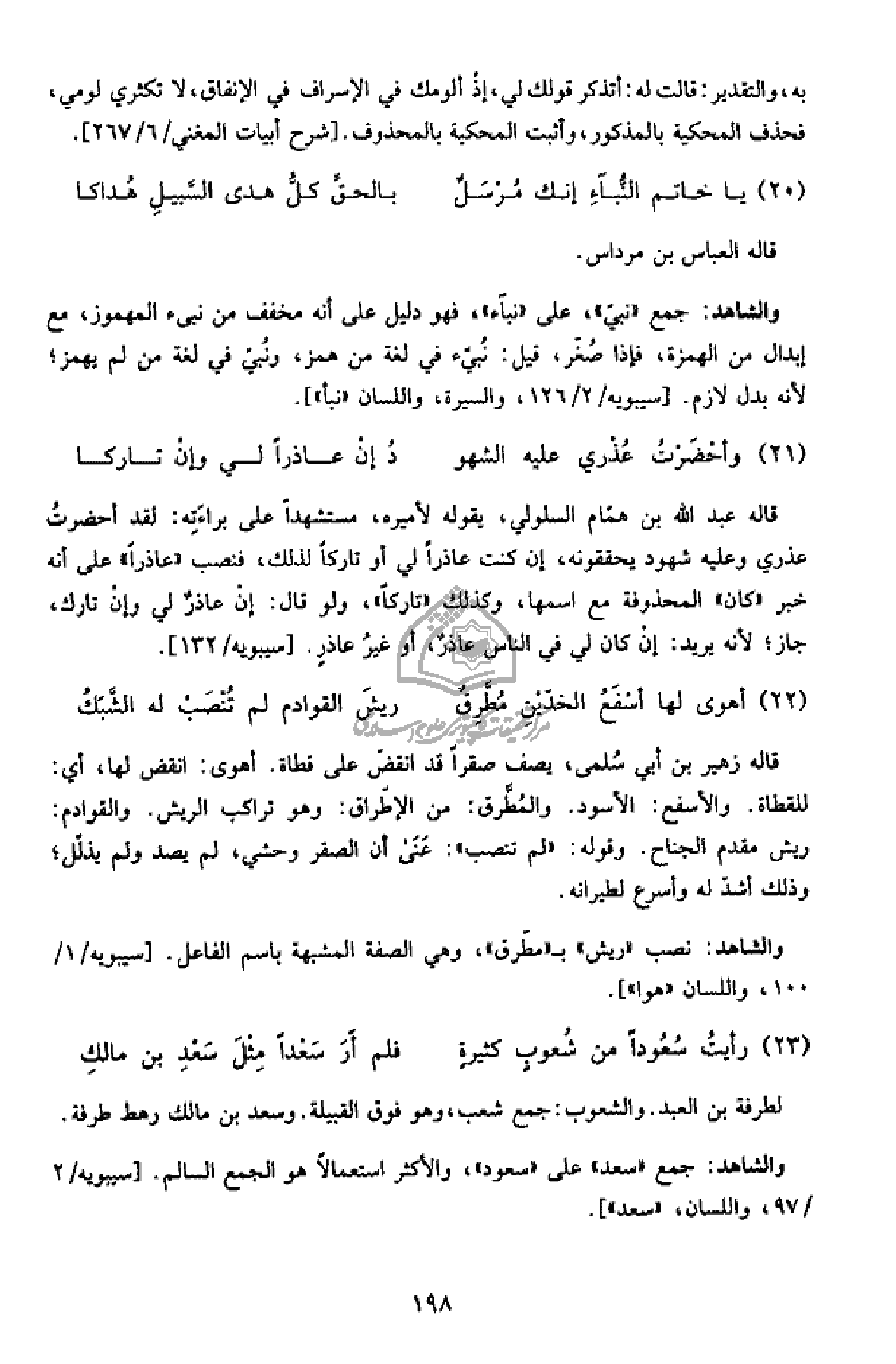 والشاهد: جمع «نبيّ»، على «نبآء»، فهو دليل على أنه مخفف من نبئ المهموز، مع إبدال من الهمزة، فإذا صغّر، قيل: نبيّء في لغة من همز، ونبيّ في لغة من لم يهمز؛ لأنه بدل لازم. [سيبويه/ 2/ 126، والسيرة، واللسان «نبأ»].