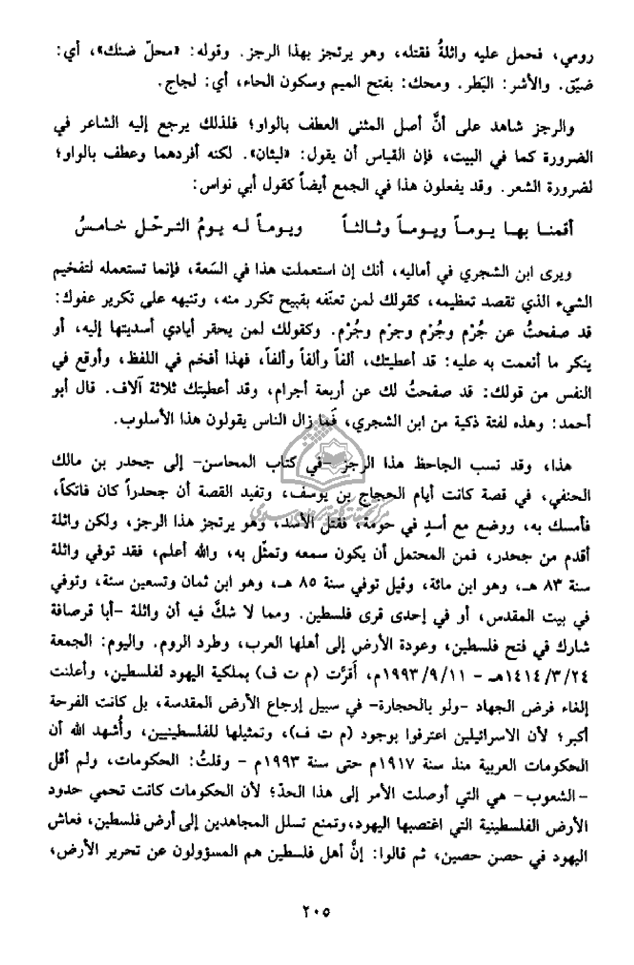 هذا، وقد نسب الجاحظ هذا الرجز - في كتاب المحاسن - إلى جحدر بن مالك الحنفي، في قصة كانت أيام الحجاج بن يوسف، وتفيد القصة أن جحدرا كان فاتكا، فأمسك به، ووضع مع أسد في حومة، فقتل الأسد، وهو يرتجز هذا الرجز، ولكن واثلة أقدم من جحدر، فمن المحتمل أن يكون سمعه وتمثّل به، والله أعلم، فقد توفي واثلة سنة 83 هـ، وهو ابن مائة، وقيل توفي سنة 85 هـ، وهو ابن ثمان وتسعين سنة، وتوفي في بيت المقدس، أو في إحدى قرى فلسطين. ومما لا شكّ فيه أن واثلة - أبا قرصافة شارك في فتح فلسطين، وعودة الأرض إلى أهلها العرب، وطرد الروم. واليوم: الجمعة 24/ 3 / 1414 هـ - 11/ 9 / 1993 م، أقرّت (م ت ف) بملكية اليهود لفلسطين، وأعلنت إلغاء فرض الجهاد - ولو بالحجارة - في سبيل إرجاع الأرض المقدسة، بل كانت الفرحة أكبر؛ لأن الاسرائيلين اعترفوا بوجود (م ت ف)، وتمثيلها للفلسطينيين، وأشهد الله أن الحكومات العربية منذ سنة 1917 م حتى سنة 1993 م - وقلت: الحكومات، ولم أقل - الشعوب - هي التي أوصلت الأمر إلى هذا الحدّ؛ لأن الحكومات كانت تحمي حدود الأرض الفلسطينية التي اغتصبها اليهود، وتمنع تسلل المجاهدين إلى أرض فلسطين، فعاش اليهود في حصن حصين، ثم قالوا: إنّ أهل فلسطين هم المسؤولون عن تحرير الأرض،