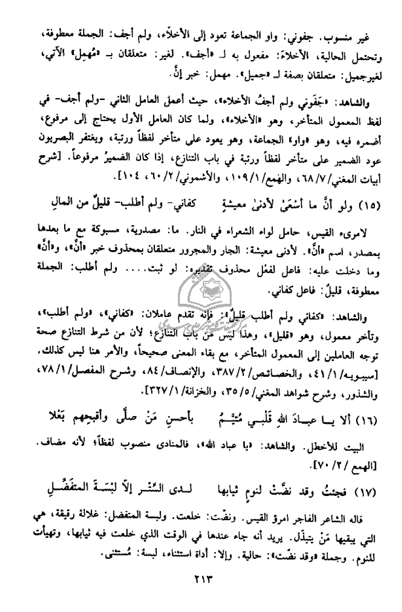 والشاهد: «جفوني ولم أجف الأخلاء»، حيث أعمل العامل الثاني - ولم أجف - في لفظ المعمول المتأخر، وهو «الأخلاء»، ولما كان العامل الأول يحتاج إلى مرفوع، أضمره فيه، وهو «واو» الجماعة، وهو يعود على متأخر لفظا ورتبة، ويغتفر البصريون عود الضمير على متأخر لفظا ورتبة في باب التنازع، إذا كان الضمير مرفوعا. [شرح أبيات المغني/ 7/ 68، والهمع/ 1/ 109، والأشموني/ 2/ 60، 104].