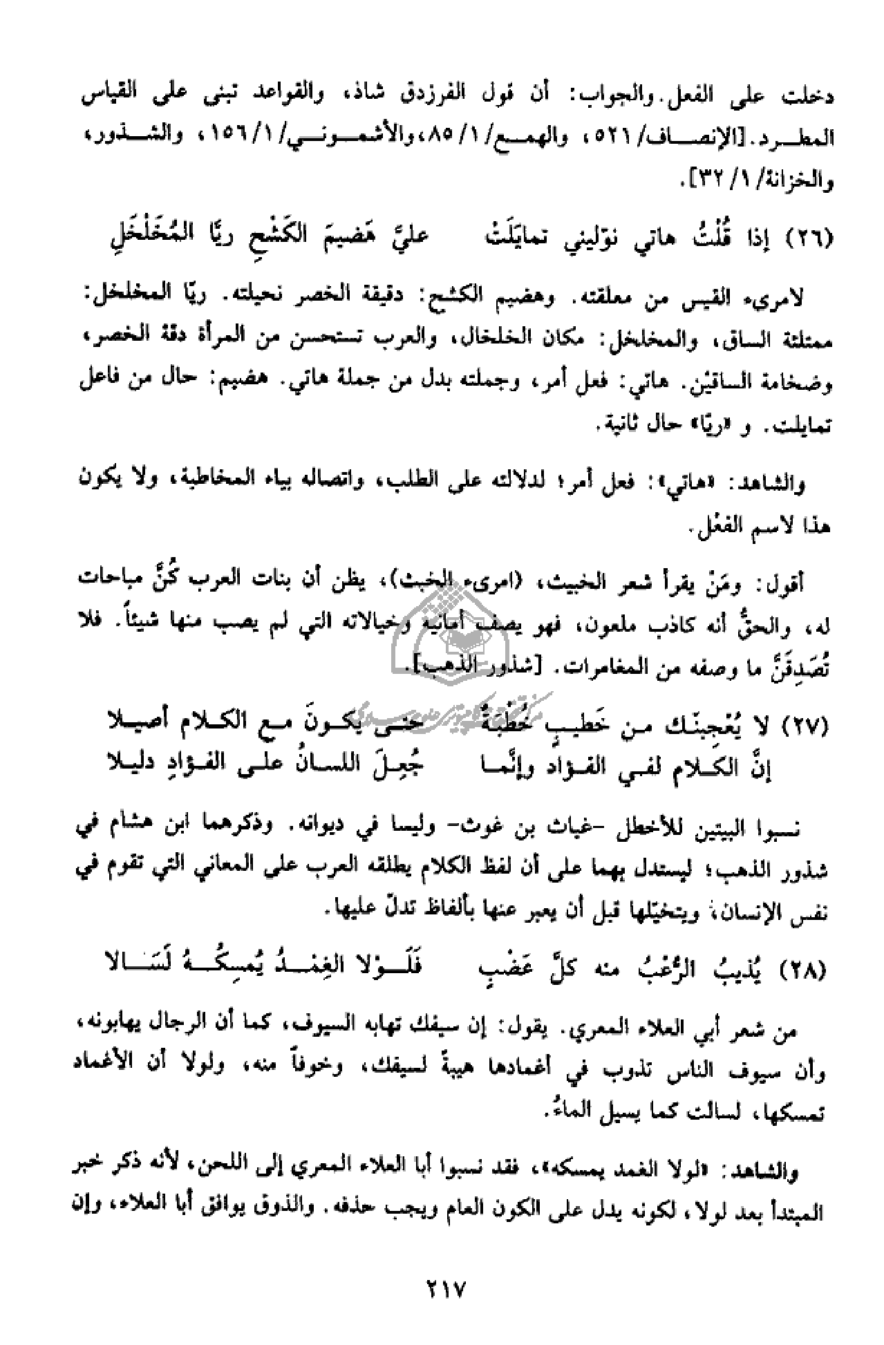 والشاهد: «لولا الغمد يمسكه»، فقد نسبوا أبا العلاء المعري إلى اللحن، لأنه ذكر خبر المبتدأ بعد لولا، لكونه يدل على الكون العام ويجب حذفه. والذوق يوافق أبا العلاء، وإن