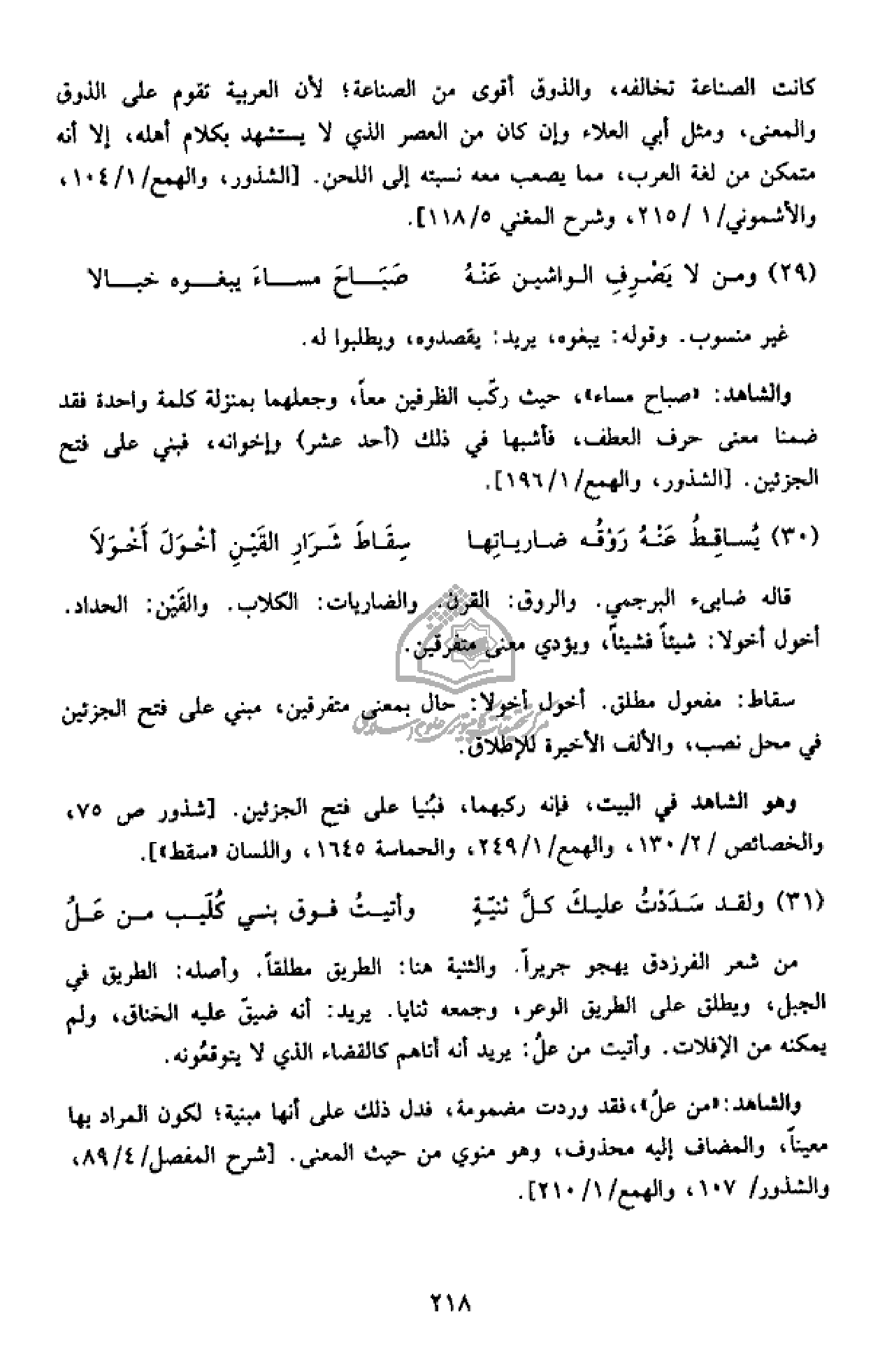 كانت الصناعة تخالفه، والذوق أقوى من الصناعة؛ لأن العربية تقوم على الذوق والمعنى، ومثل أبي العلاء وإن كان من العصر الذي لا يستشهد بكلام أهله، إلا أنه متمكن من لغة العرب، مما يصعب معه نسبته إلى اللحن. [الشذور، والهمع/ 1/ 104، والأشموني/ 1/ 215، وشرح المغني 5/ 118].