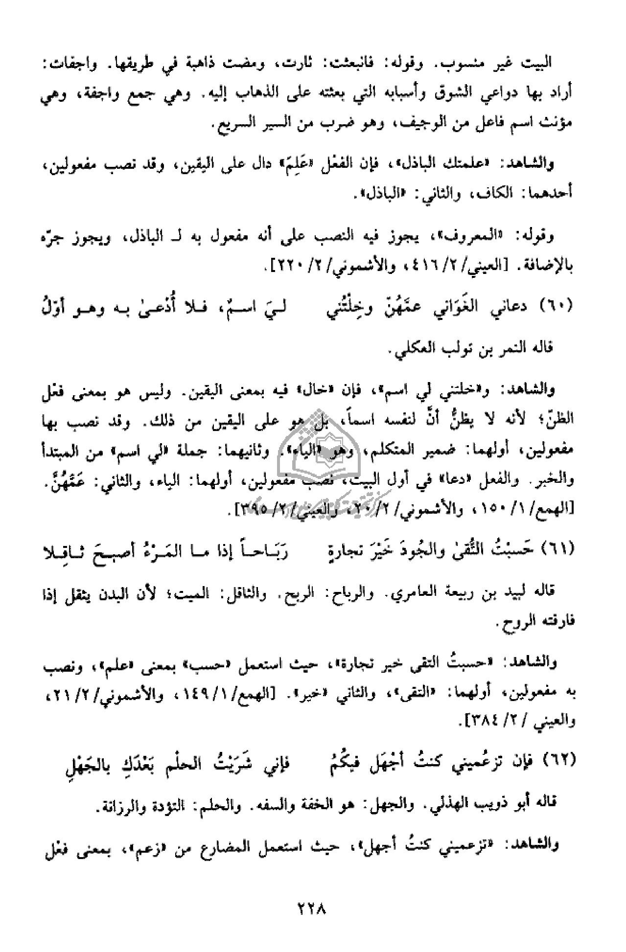والشاهد: «حسبت التقى خير تجارة»، حيث استعمل «حسب» بمعنى «علم»، ونصب به مفعولين، أولهما: «التقى»، والثاني «خير». [الهمع/ 1/ 149، والأشموني/ 2/ 21، والعيني/ 2/ 384].