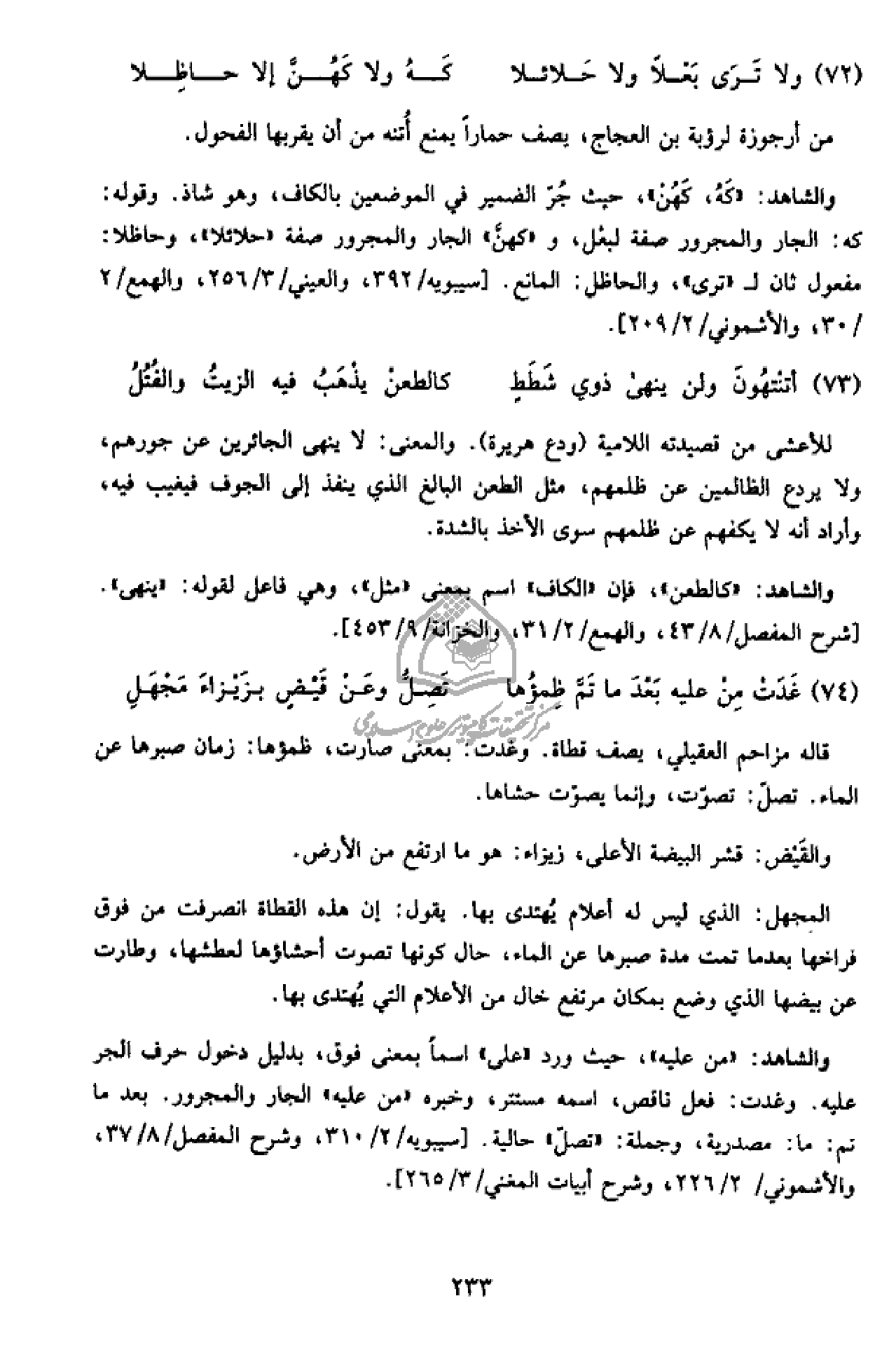 والشاهد: «من عليه»، حيث ورد «على» اسما بمعنى فوق، بدليل دخول حرف الجر عليه. وغدت: فعل ناقص، اسمه مستتر، وخبره «من عليه» الجار والمجرور. بعد ما تم: ما: مصدرية، وجملة: «تصلّ» حالية. [سيبويه/ 2/ 310، وشرح المفصل/ 8/ 37، والأشموني/ 2/ 226، وشرح أبيات المغني/ 3/ 265].