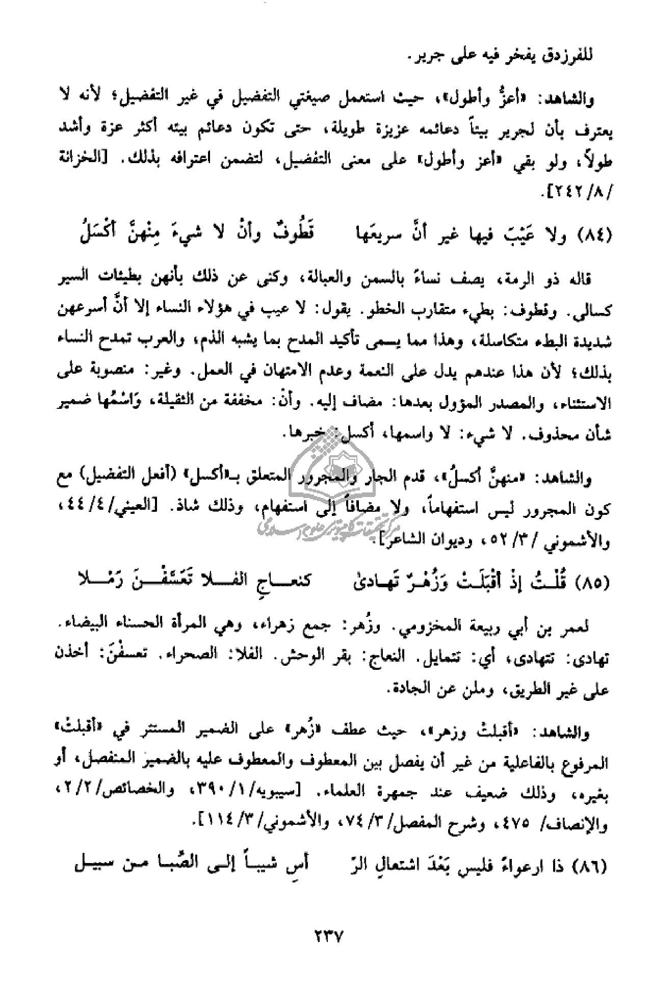 والشاهد: «منهنّ أكسل»، قدم الجار والمجرور المتعلق ب «أكسل» (أفعل التفضيل) مع كون المجرور ليس استفهاما، ولا مضافا إلى استفهام، وذلك شاذ. [العيني/ 4/ 44، والأشموني/ 3/ 52، وديوان الشاعر].