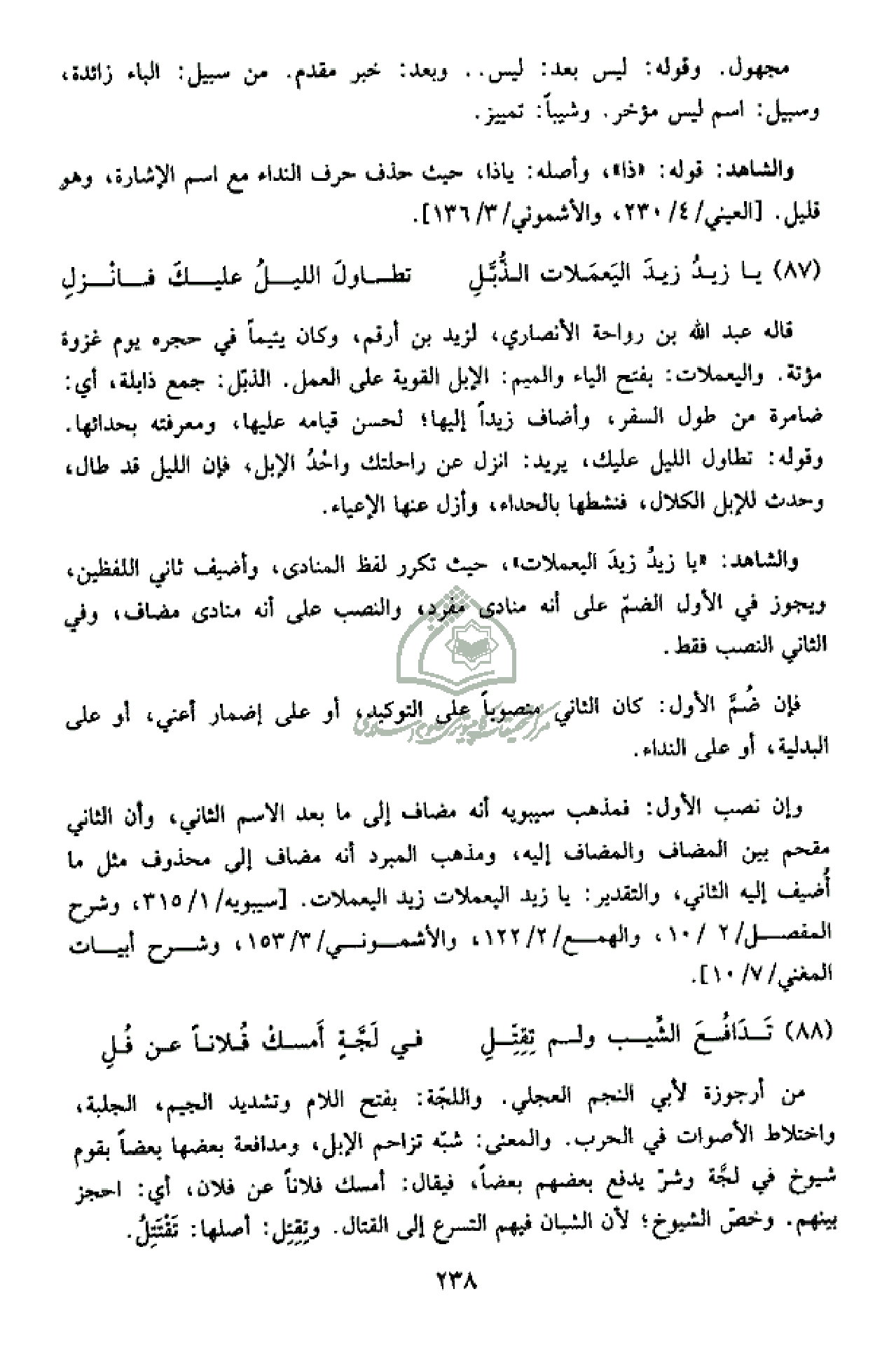 والشاهد: «يا زيد زيد اليعملات»، حيث تكرر لفظ المنادى، وأضيف ثاني اللفظين، ويجوز في الأول الضمّ على أنه منادى مفرد، والنصب على أنه منادى مضاف، وفي الثاني النصب فقط.