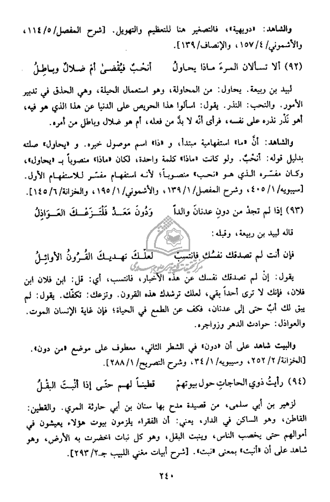 لبيد بن ربيعة. يحاول: من المحاولة، وهو استعمال الحيلة، وهي الحذق في تدبير الأمور. والنحب: النذر. يقول: اسألوا هذا الحريص على الدنيا عن هذا الذي هو فيه، أهو نذر نذره على نفسه، فرأى أنّه لا بدّ من فعله، أم هو ضلال وباطل من أمره.