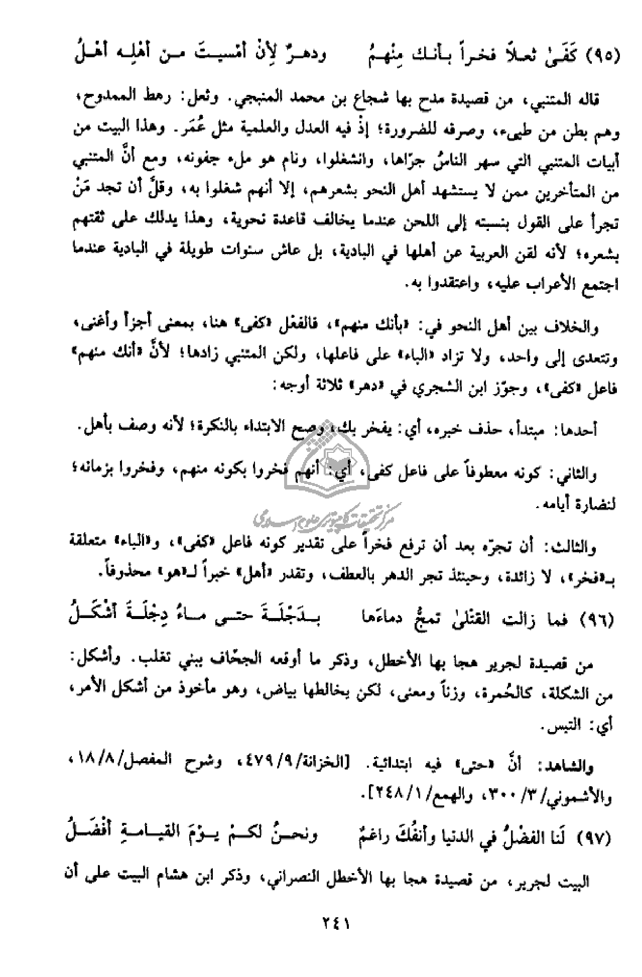 والخلاف بين أهل النحو في: «بأنك منهم»، فالفعل «كفى» هنا، بمعنى أجزأ وأغنى، وتتعدى إلى واحد، ولا تزاد «الباء» على فاعلها، ولكن المتنبي زادها؛ لأنّ «أنك منهم» فاعل «كفى»، وجوّز ابن الشجري في «دهر» ثلاثة أوجه: