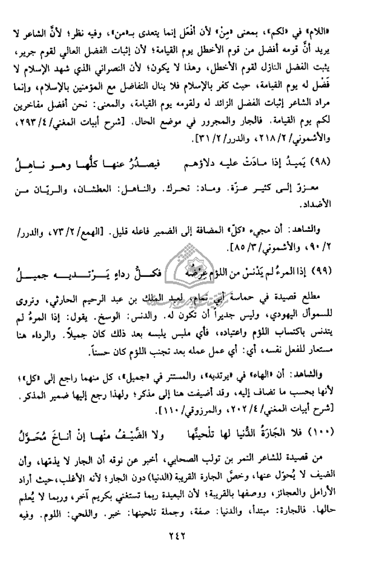 «اللام» في «لكم»، بمعنى «من» لأن أفعل إنما يتعدى ب «من»، وفيه نظر؛ لأنّ الشاعر لا يريد أنّ قومه أفضل من قوم الأخطل يوم القيامة؛ لأن إثبات الفضل العالي لقوم جرير، يثبت الفضل النازل لقوم الأخطل، وهذا لا يكون؛ لأن النصراني الذي شهد الإسلام لا فضل له يوم القيامة، حيث كفر بالإسلام فلا ينال التفاضل مع المؤمنين بالإسلام، وإنما مراد الشاعر إثبات الفضل الزائد له ولقومه يوم القيامة، والمعنى: نحن أفضل مفاخرين لكم يوم القيامة.