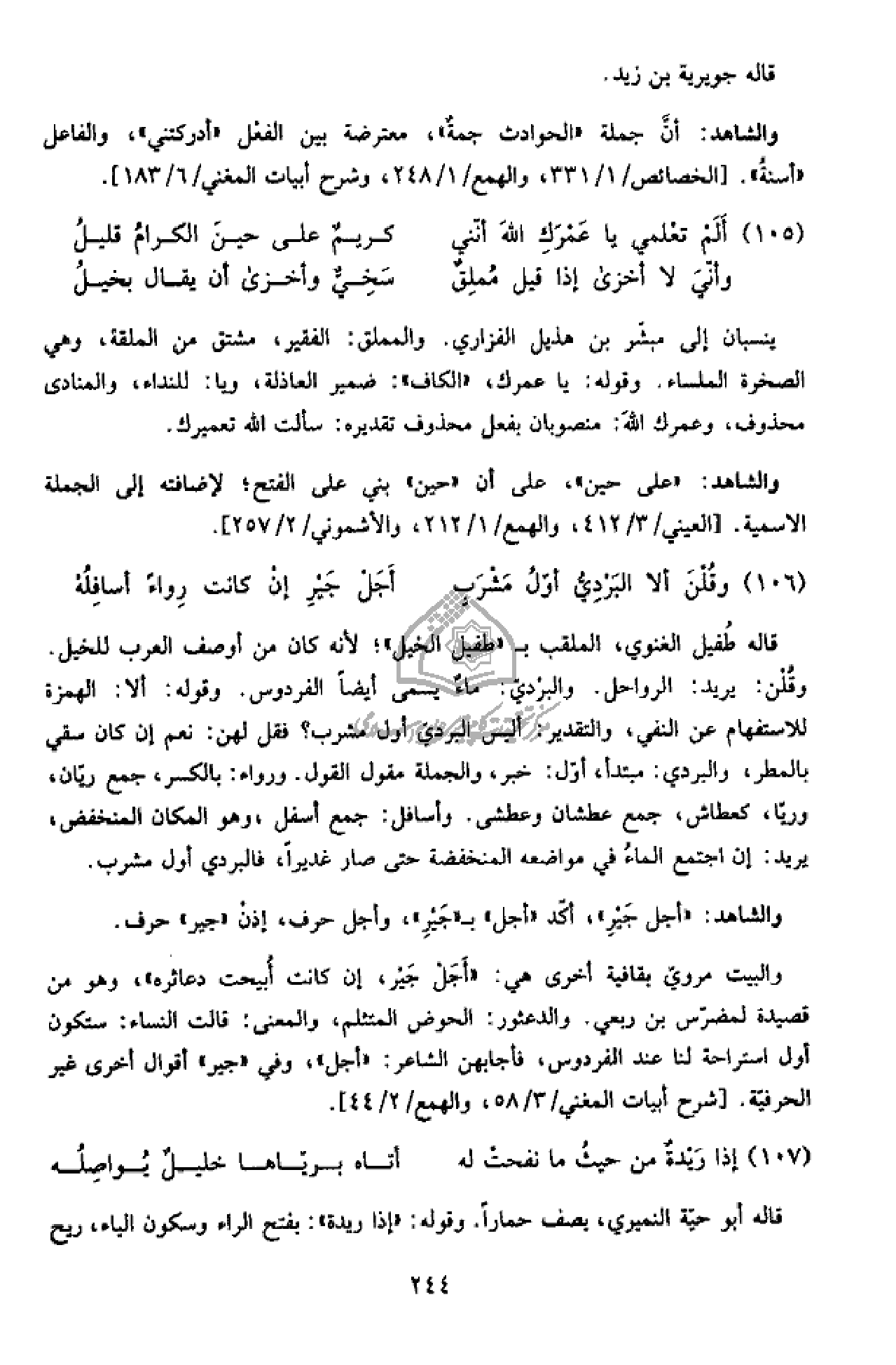 والبيت مرويّ بقافية أخرى هي: «أجل جير، إن كانت أبيحت دعاثره»، وهو من قصيدة لمضرّس بن ربعي. والدعثور: الحوض المتثلم، والمعنى: قالت النساء: ستكون أول استراحة لنا عند الفردوس، فأجابهن الشاعر: «أجل»، وفي «جير» أقوال أخرى غير الحرفيّة. [شرح أبيات المغني/ 3/ 58، والهمع/ 2/ 44].