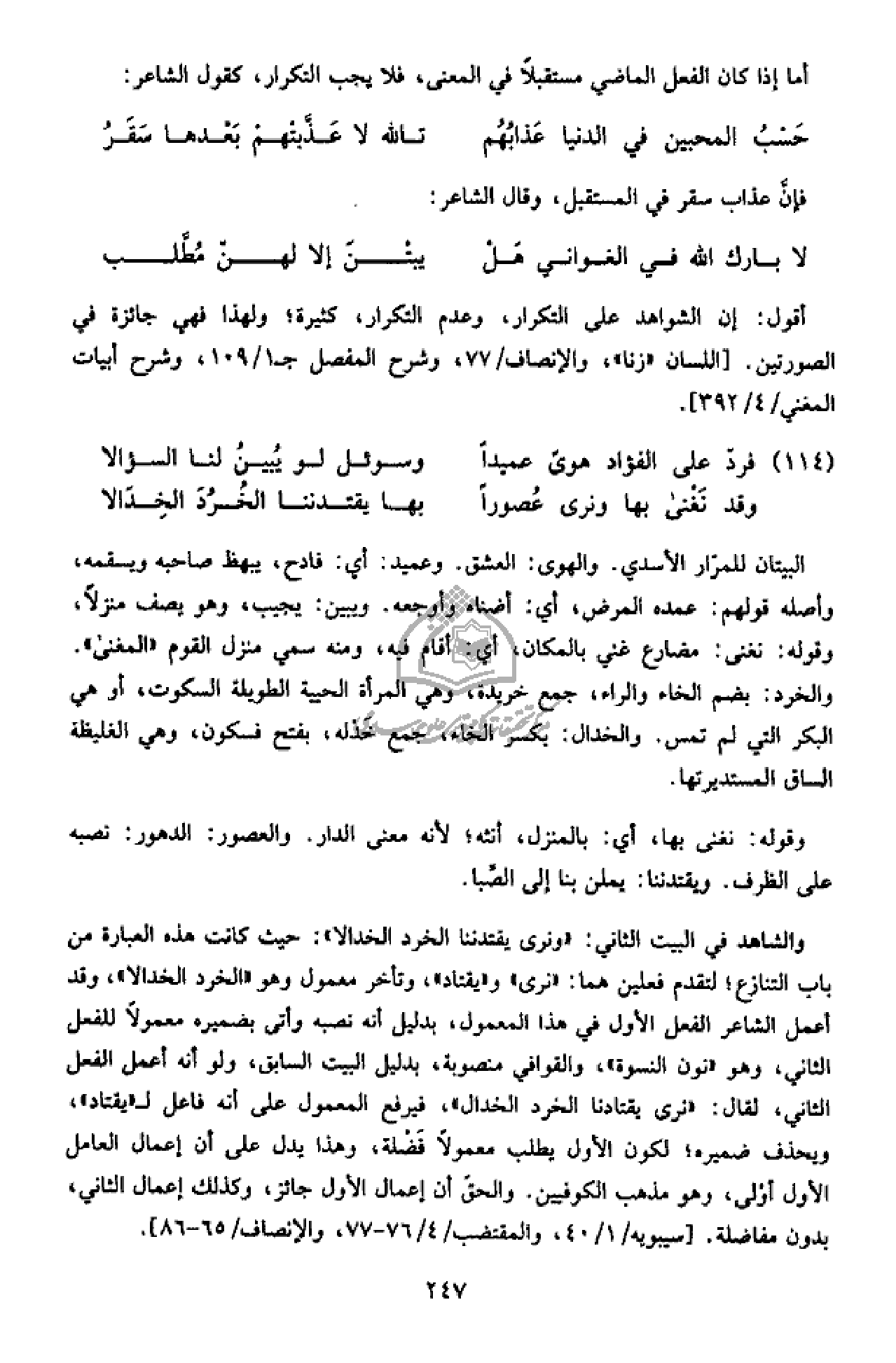 أقول: إن الشواهد على التكرار، وعدم التكرار، كثيرة؛ ولهذا فهي جائزة في الصورتين. [اللسان «زنا»، والإنصاف/ 77، وشرح المفصل ج 1/ 109، وشرح أبيات المغني/ 4/ 392].