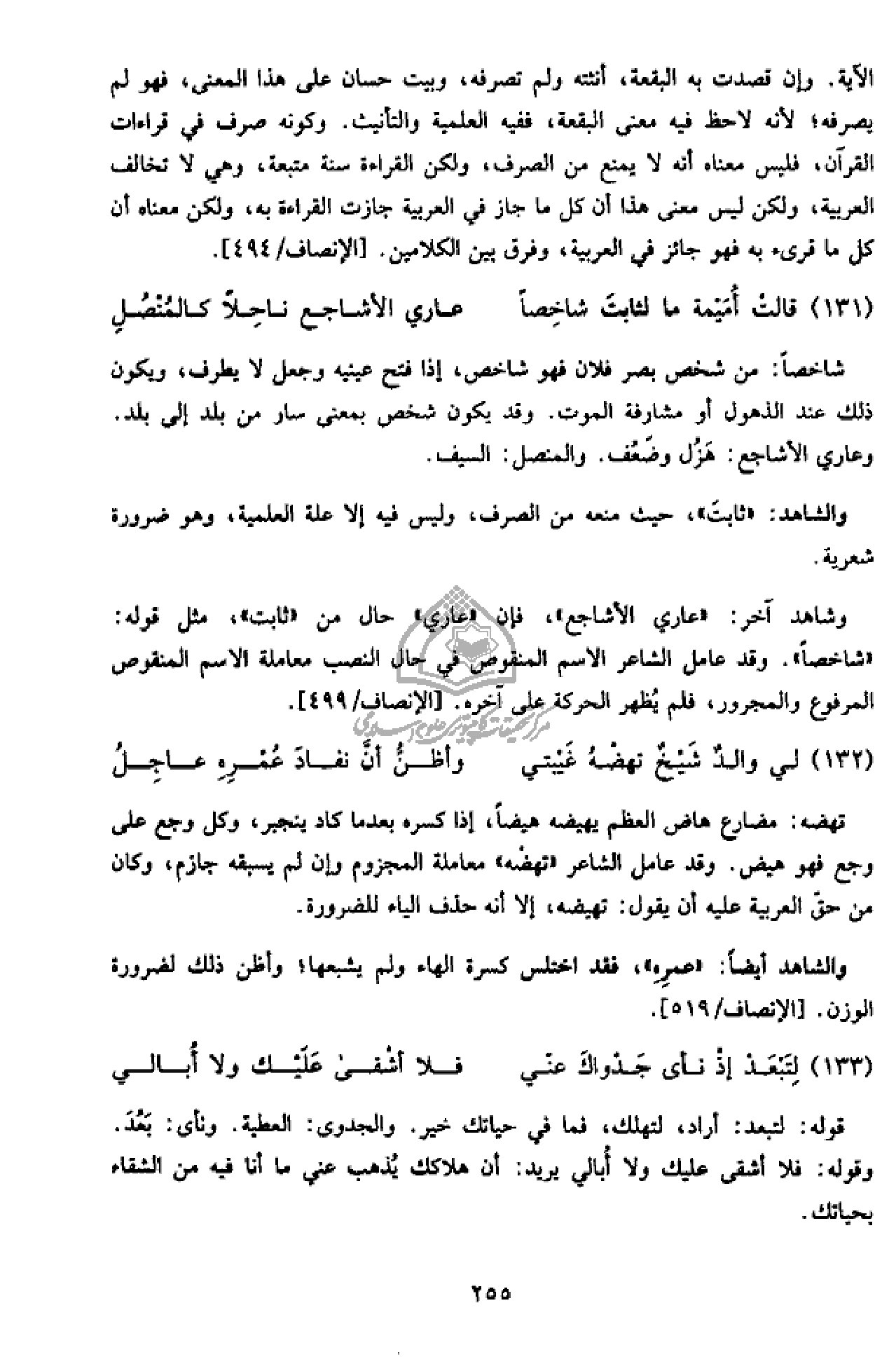«شاخصا». وقد عامل الشاعر الاسم المنقوص في حال النصب معاملة الاسم المنقوص المرفوع والمجرور، فلم يظهر الحركة على آخره. [الإنصاف/ 499].