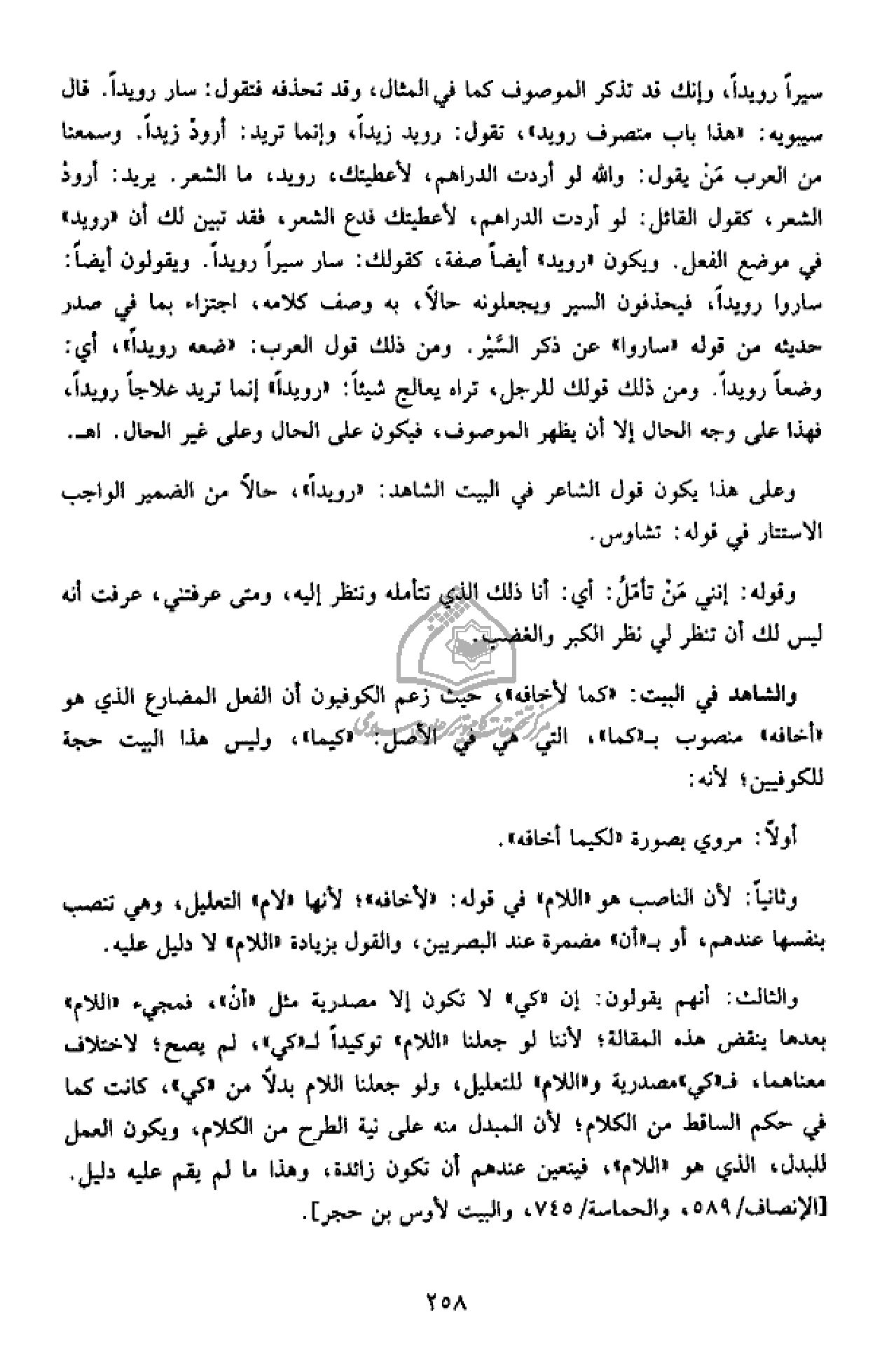 والشاهد في البيت: «كما لأخافه»، حيث زعم الكوفيون أن الفعل المضارع الذي هو «أخافه» منصوب ب «كما»، التي هي في الأصل: «كيما»، وليس هذا البيت حجة للكوفيين؛ لأنه: