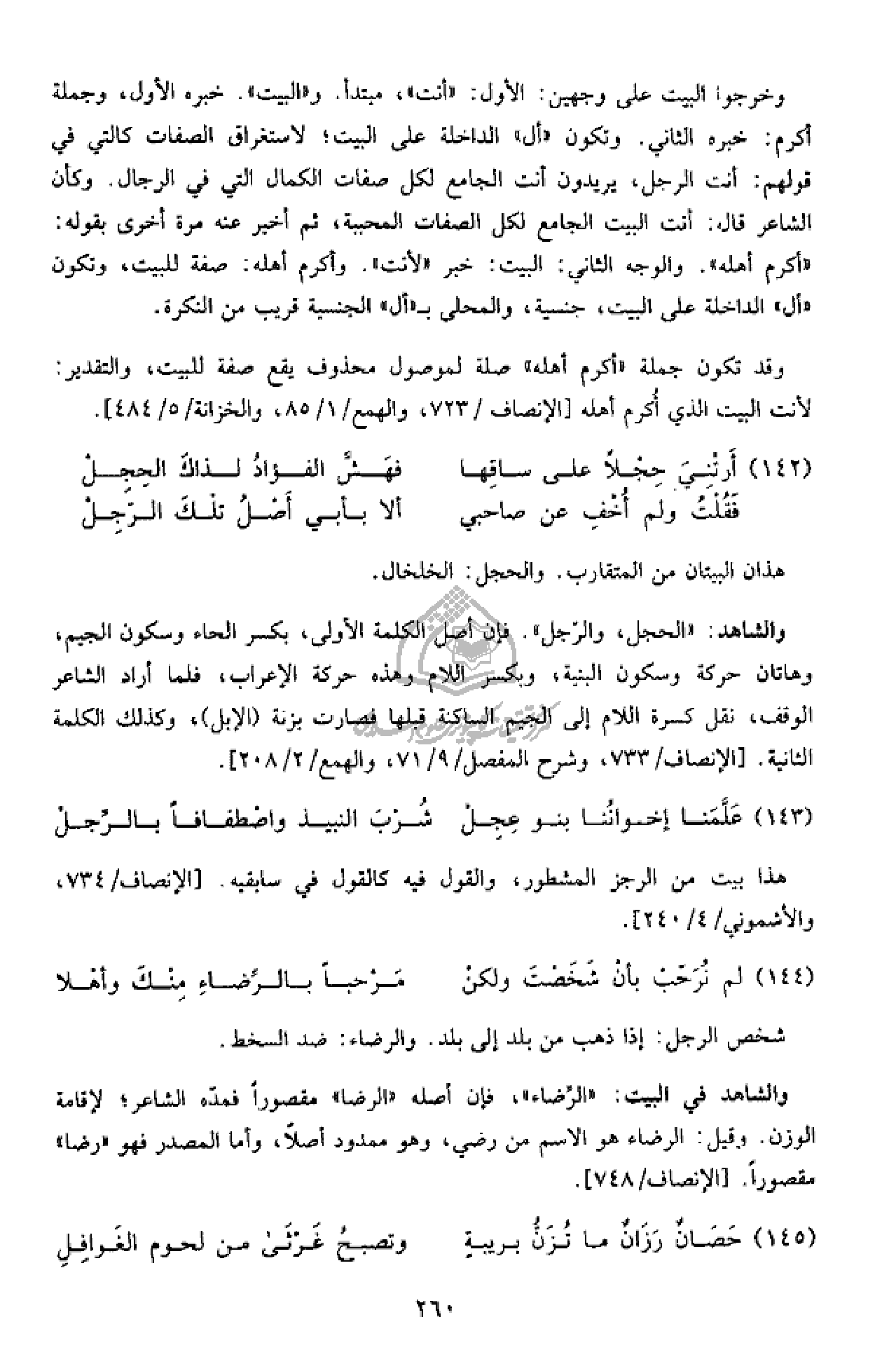 والشاهد: «الحجل، والرّجل». فإن أصل الكلمة الأولى، بكسر الحاء وسكون الجيم، وهاتان حركة وسكون البنية، وبكسر اللام وهذه حركة الإعراب، فلما أراد الشاعر الوقف، نقل كسرة اللام إلى الجيم الساكنة قبلها فصارت بزنة (الإبل)، وكذلك الكلمة الثانية. [الإنصاف/ 733، وشرح المفصل/ 9/ 71، والهمع/ 2/ 208].