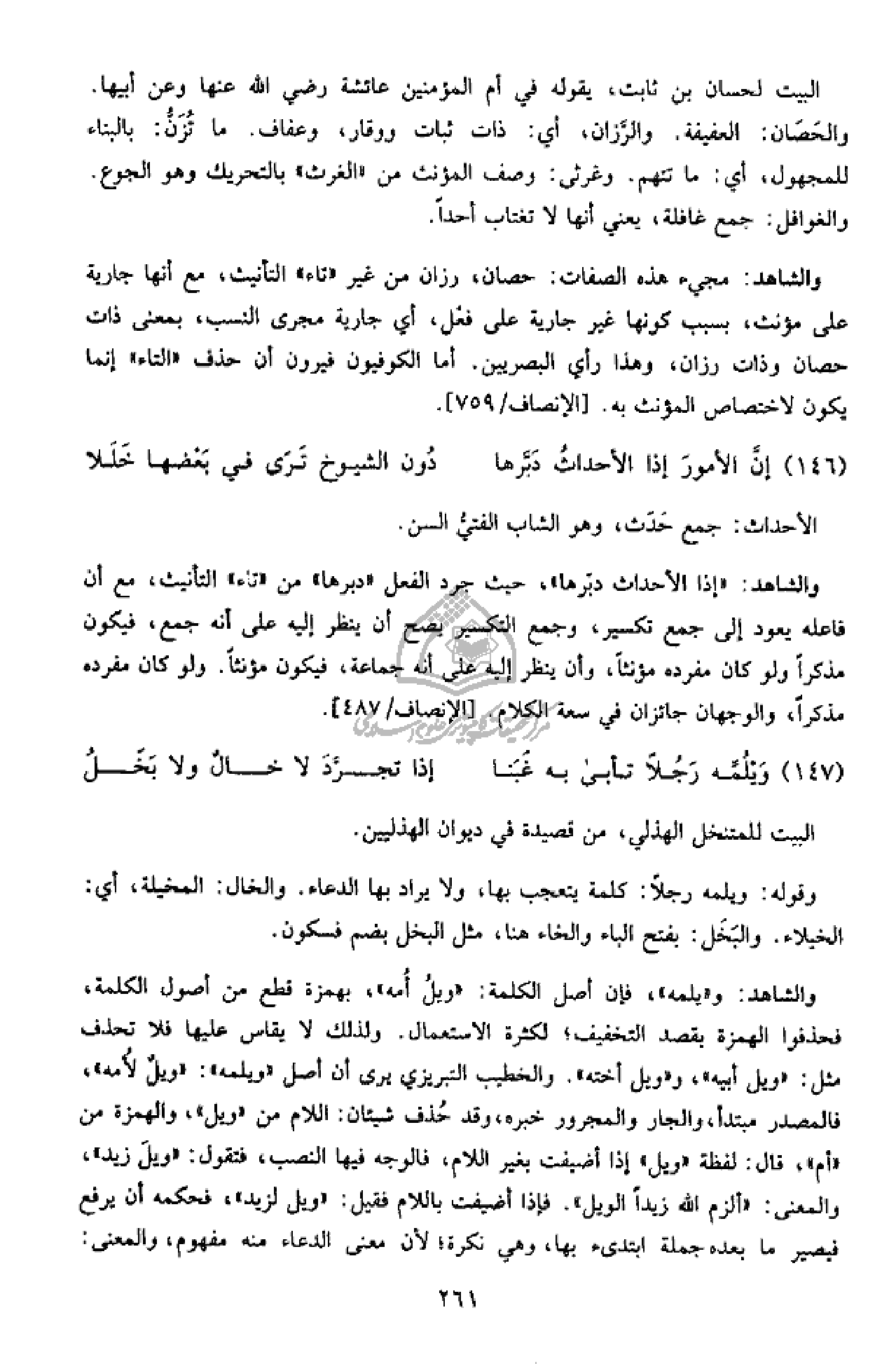 والشاهد: مجيء هذه الصفات: حصان، رزان من غير «تاء» التأنيث، مع أنها جارية على مؤنث، بسبب كونها غير جارية على فعل، أي جارية مجرى النسب، بمعنى ذات حصان وذات رزان، وهذا رأي البصريين. أما الكوفيون فيرون أن حذف «التاء» إنما يكون لاختصاص المؤنث به. [الإنصاف/ 759].