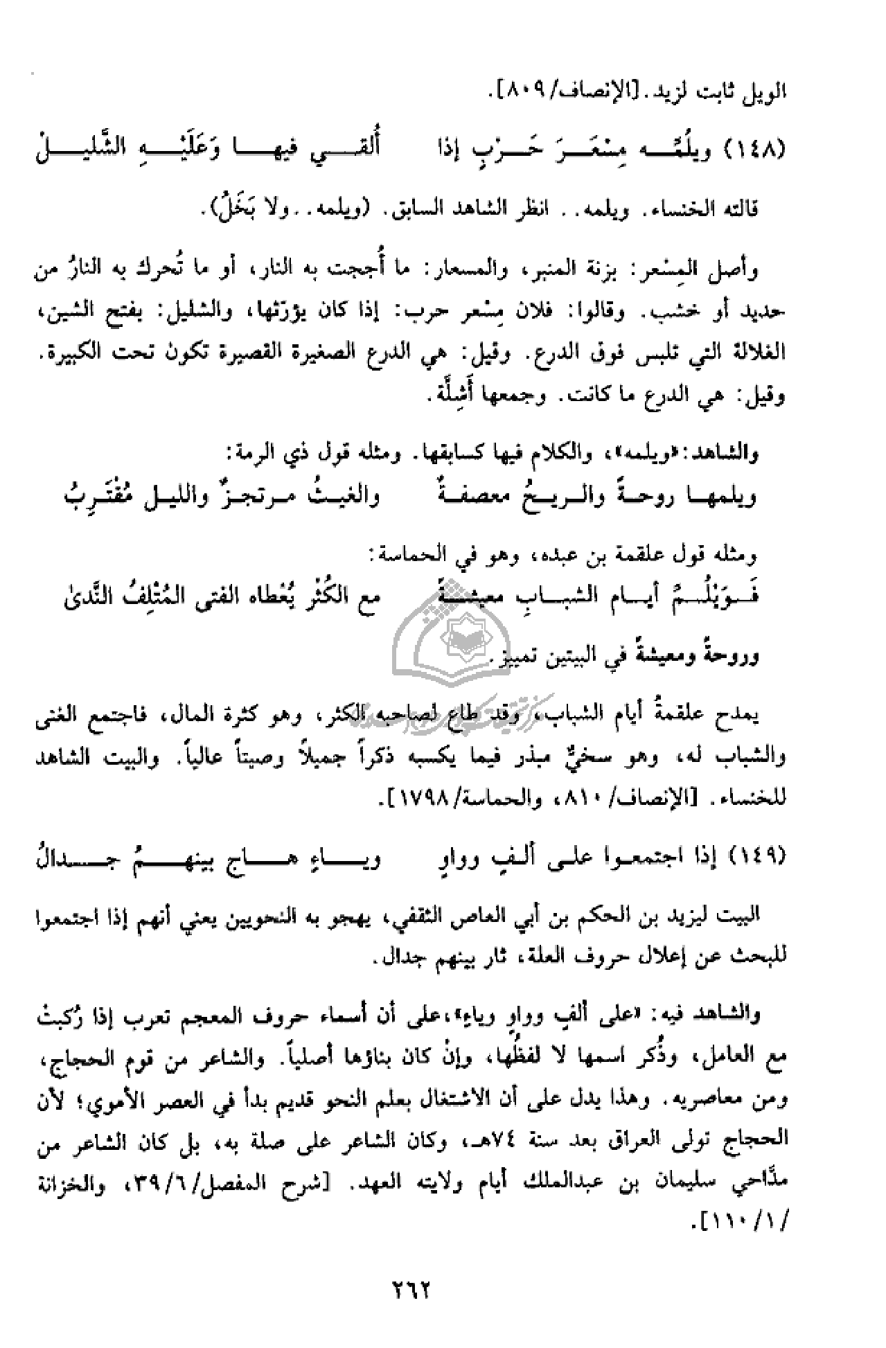 والشاهد فيه: «على ألف وواو وياء»، على أن أسماء حروف المعجم تعرب إذا ركبت مع العامل، وذكر اسمها لا لفظها، وإن كان بناؤها أصليا. والشاعر من قوم الحجاج، ومن معاصريه. وهذا يدل على أن الاشتغال بعلم النحو قديم بدأ في العصر الأموي؛ لأن الحجاج تولى العراق بعد سنة 74 هـ، وكان الشاعر على صلة به، بل كان الشاعر من مدّاحي سليمان بن عبد الملك أيام ولايته العهد. [شرح المفصل/ 6/ 39، والخزانة/ 1/ 110].