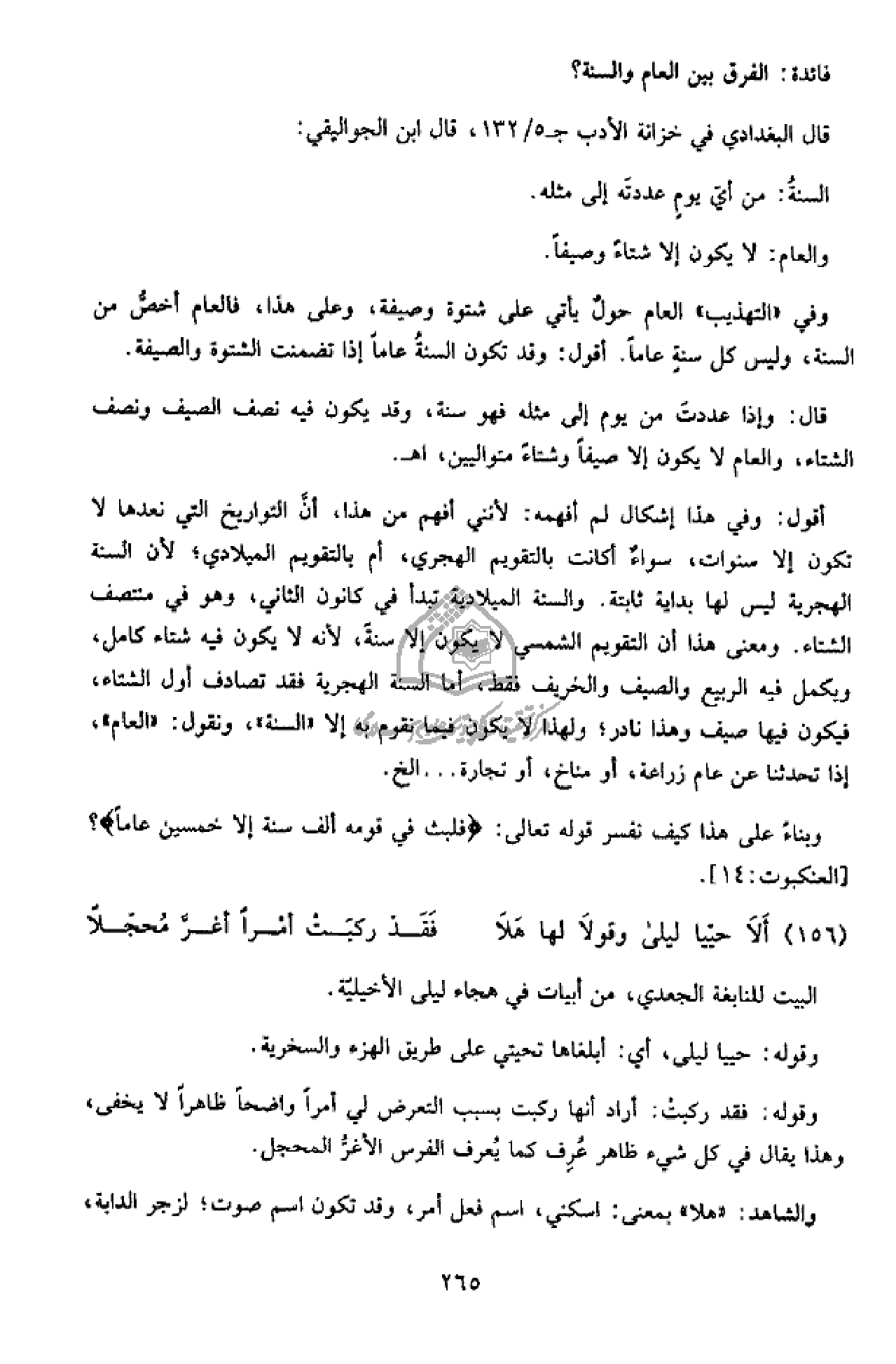 وفي «التهذيب» العام حول يأتي على شتوة وصيفة، وعلى هذا، فالعام أخصّ من السنة، وليس كل سنة عاما. أقول: وقد تكون السنة عاما إذا تضمنت الشتوة والصيفة.