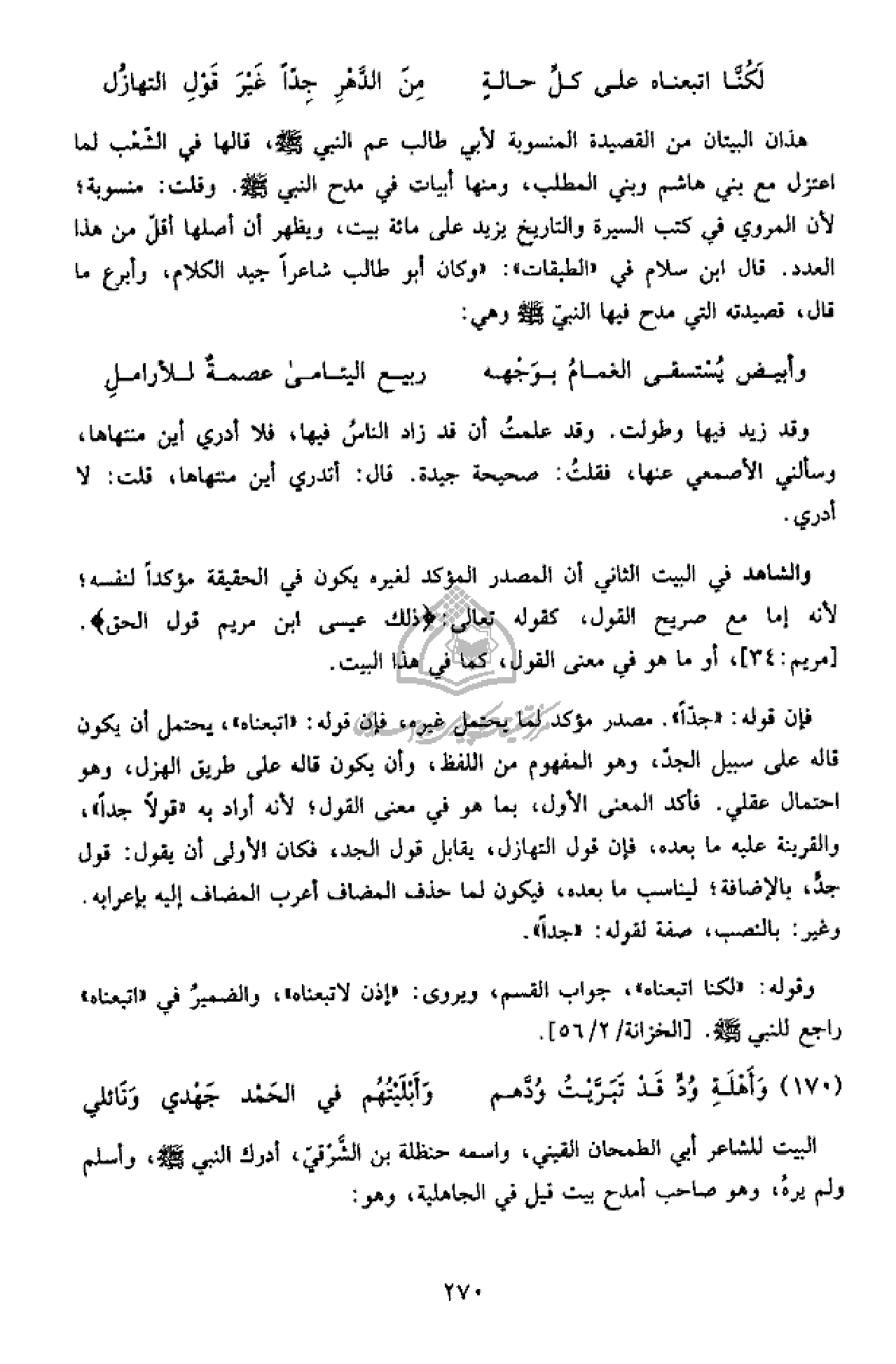 وقوله: «لكنا اتبعناه»، جواب القسم، ويروى: «إذن لاتبعناه»، والضمير في «اتبعناه» راجع للنبي صلّى الله عليه وسلّم. [الخزانة/ 2/ 56].