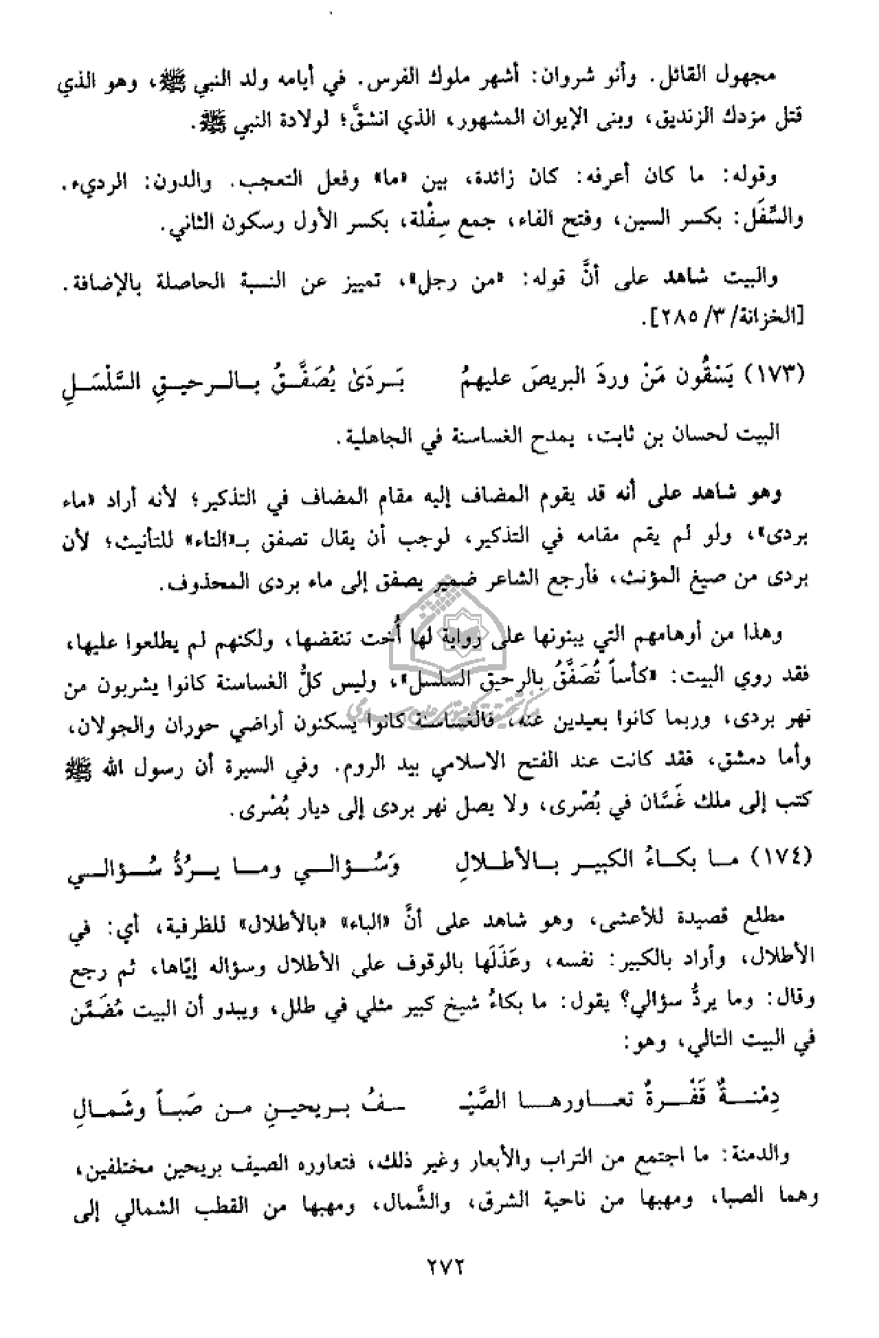 وهو شاهد على أنه قد يقوم المضاف إليه مقام المضاف في التذكير؛ لأنه أراد «ماء بردى»، ولو لم يقم مقامه في التذكير، لوجب أن يقال تصفق ب «التاء» للتأنيث؛ لأن بردى من صيغ المؤنث، فأرجع الشاعر ضمير يصفق إلى ماء بردى المحذوف.