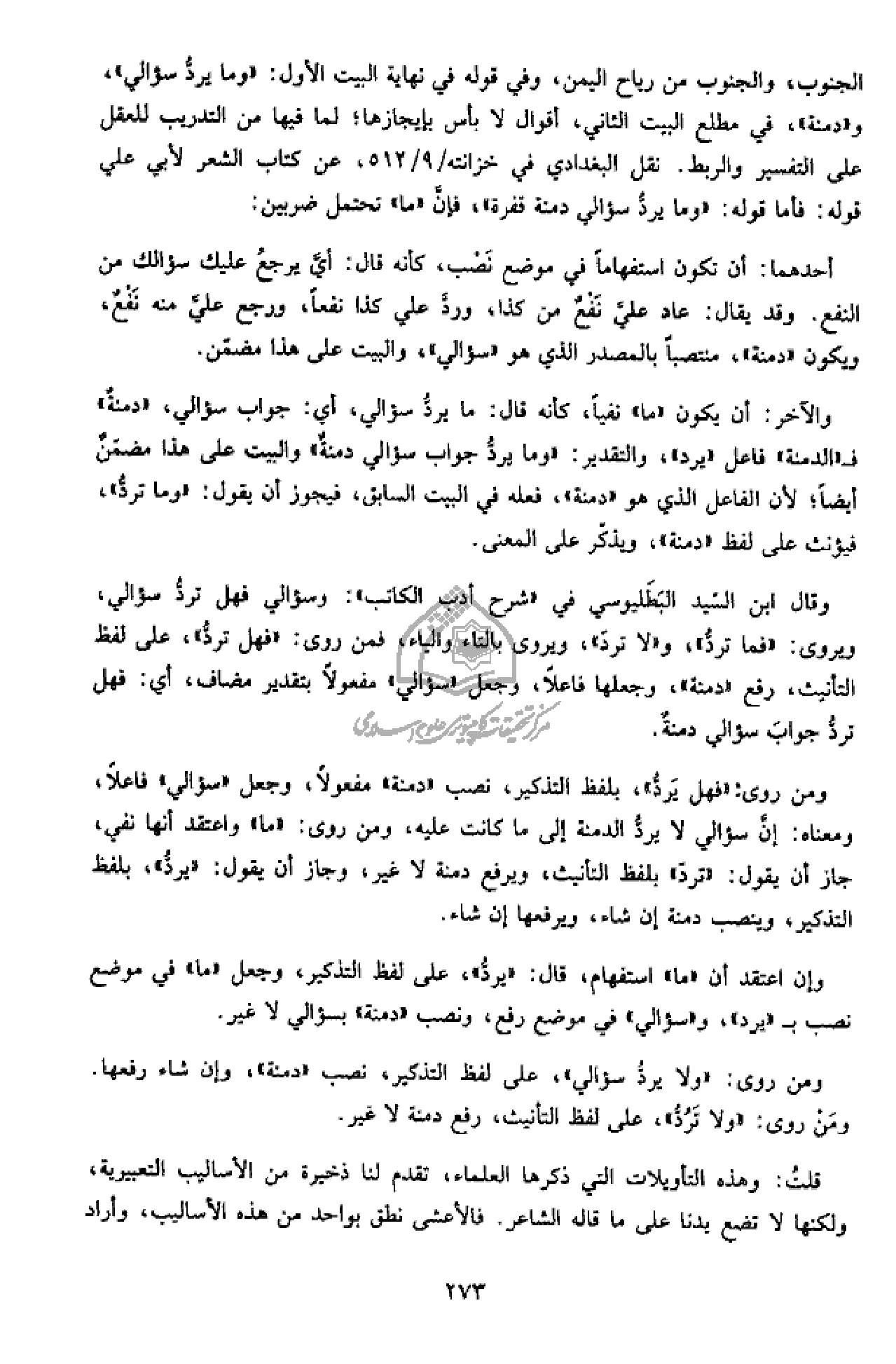 وإن اعتقد أن «ما» استفهام، قال: «يردّ»، على لفظ التذكير، وجعل «ما» في موضع نصب ب «يرد»، و «سؤالي» في موضع رفع، ونصب «دمنة» بسؤالي لا غير.