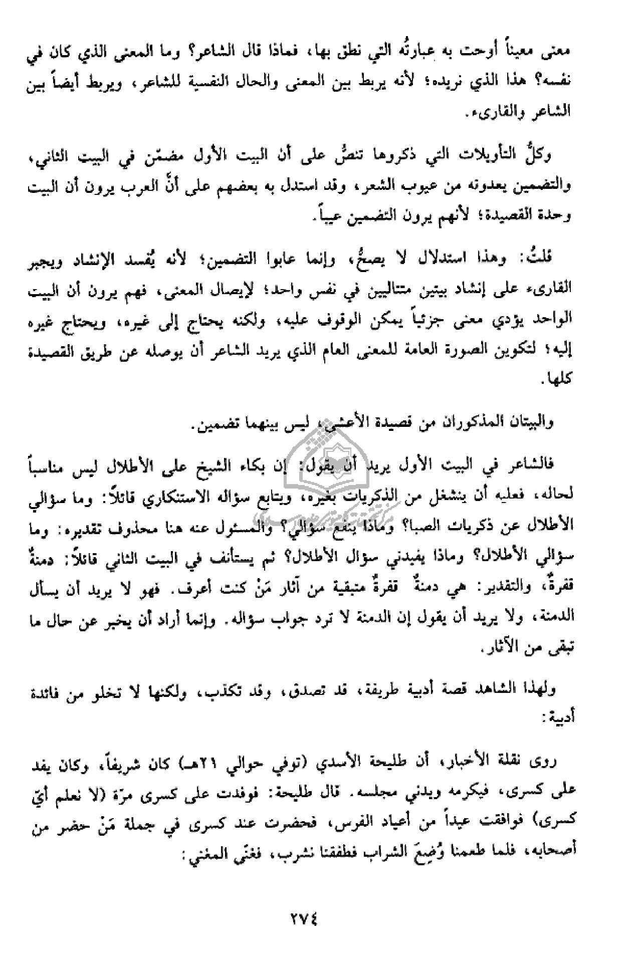 قلت: وهذا استدلال لا يصحّ، وإنما عابوا التضمين؛ لأنه يفسد الإنشاد ويجبر القارئ على إنشاد بيتين متتاليين في نفس واحد؛ لإيصال المعنى، فهم يرون أن البيت الواحد يؤدي معنى جزئيا يمكن الوقوف عليه، ولكنه يحتاج إلى غيره، ويحتاج غيره إليه؛ لتكوين الصورة العامة للمعنى العام الذي يريد الشاعر أن يوصله عن طريق القصيدة كلها.