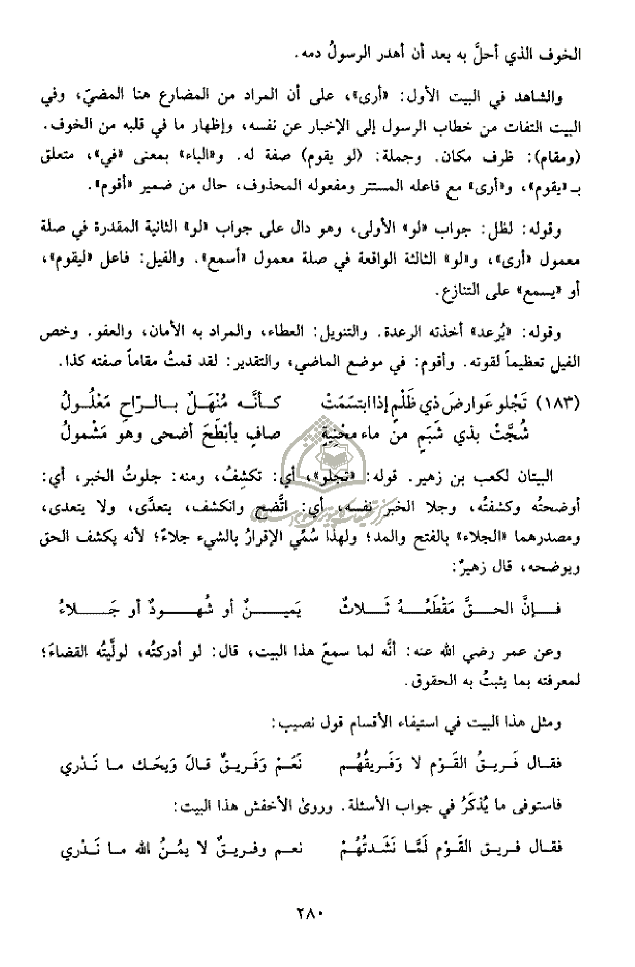 والشاهد في البيت الأول: «أرى»، على أن المراد من المضارع هنا المضيّ، وفي البيت التفات من خطاب الرسول إلى الإخبار عن نفسه، وإظهار ما في قلبه من الخوف.
