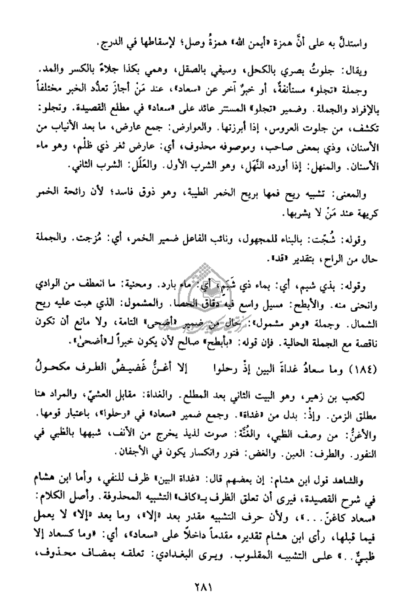 والشاهد قول ابن هشام: إن بعضهم قال: «غداة البين» ظرف للنفي، وأما ابن هشام في شرح القصيدة، فيرى أن تعلق الظرف ب «كاف» التشبيه المحذوفة. وأصل الكلام: