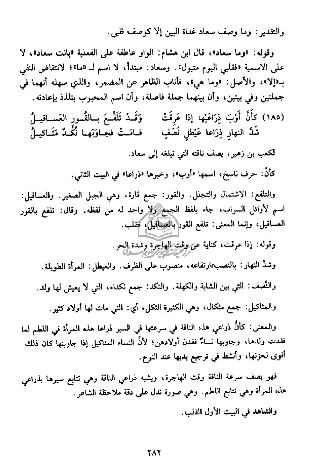وقوله: «وما سعاد»، قال ابن هشام: الواو عاطفة على الفعلية «بانت سعاد»، لا على الاسمية «فقلبي اليوم متبول». وسعاد: مبتدأ، لا اسم ل «ما»؛ لانتقاض النفي ب «إلا»، والأصل: «وما هي»، فأناب الظاهر عن المضمر، والذي سهله أنهما في جملتين وفي بيتين، وأن بينهما جملة فاصلة، وأن اسم المحبوب يتلذذ بإعادته.