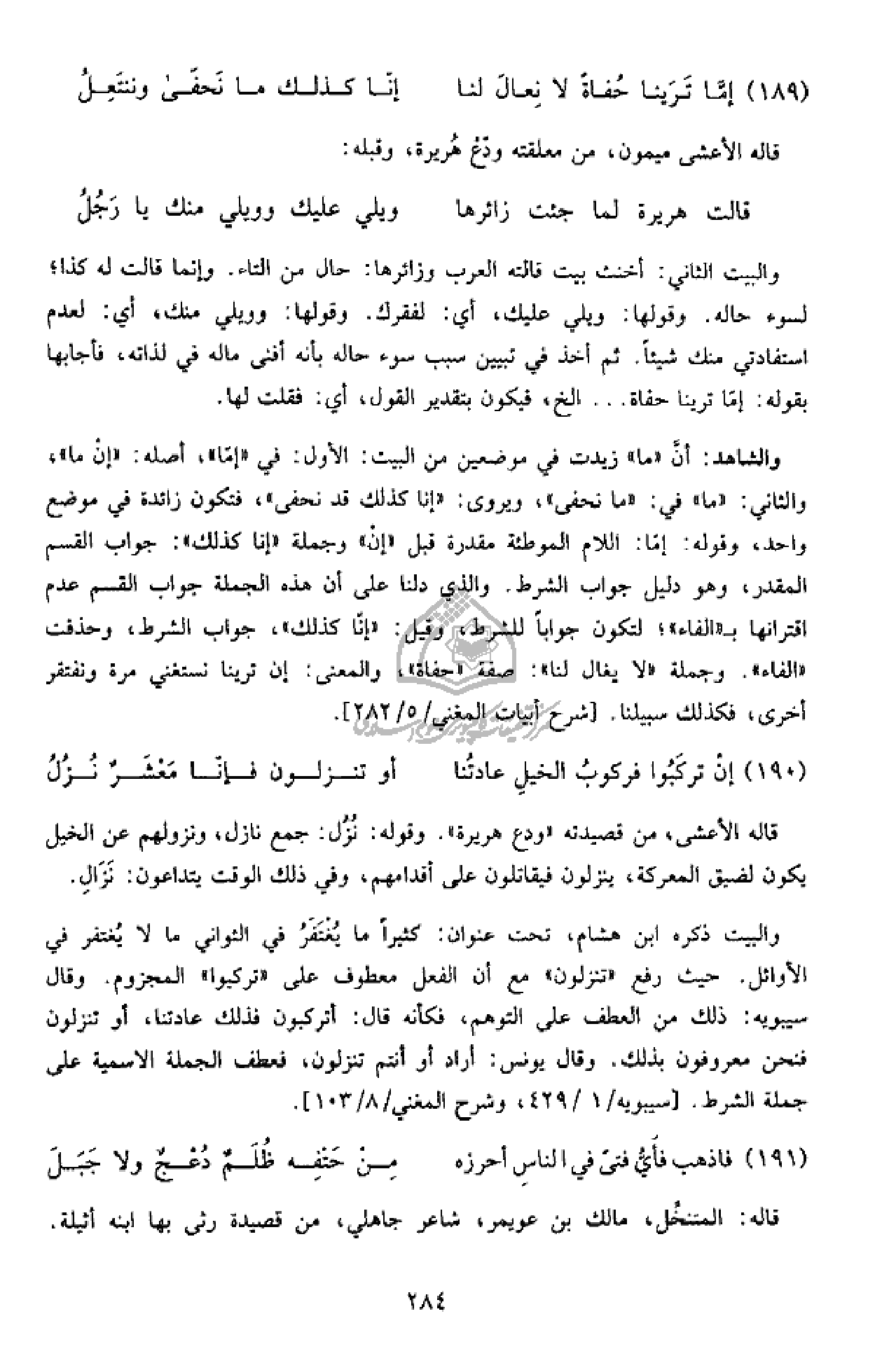 والشاهد: أنّ «ما» زيدت في موضعين من البيت: الأول: في «إمّا»، أصله: «إن ما»، والثاني: «ما» في: «ما نحفى»، ويروى: «إنا كذلك قد نحفى»، فتكون زائدة في موضع واحد، وقوله: إمّا: اللام الموطئة مقدرة قبل «إن» وجملة «إنا كذلك»: جواب القسم المقدر، وهو دليل جواب الشرط. والذي دلنا على أن هذه الجملة جواب القسم عدم اقترانها ب «الفاء»؛ لتكون جوابا للشرط، وقيل: «إنّا كذلك»، جواب الشرط، وحذفت «الفاء». وجملة «لا يغال لنا»: صفة «حفاة»، والمعنى: إن ترينا نستغني مرة ونفتقر أخرى، فكذلك سبيلنا. [شرح أبيات المغني/ 5/ 282].