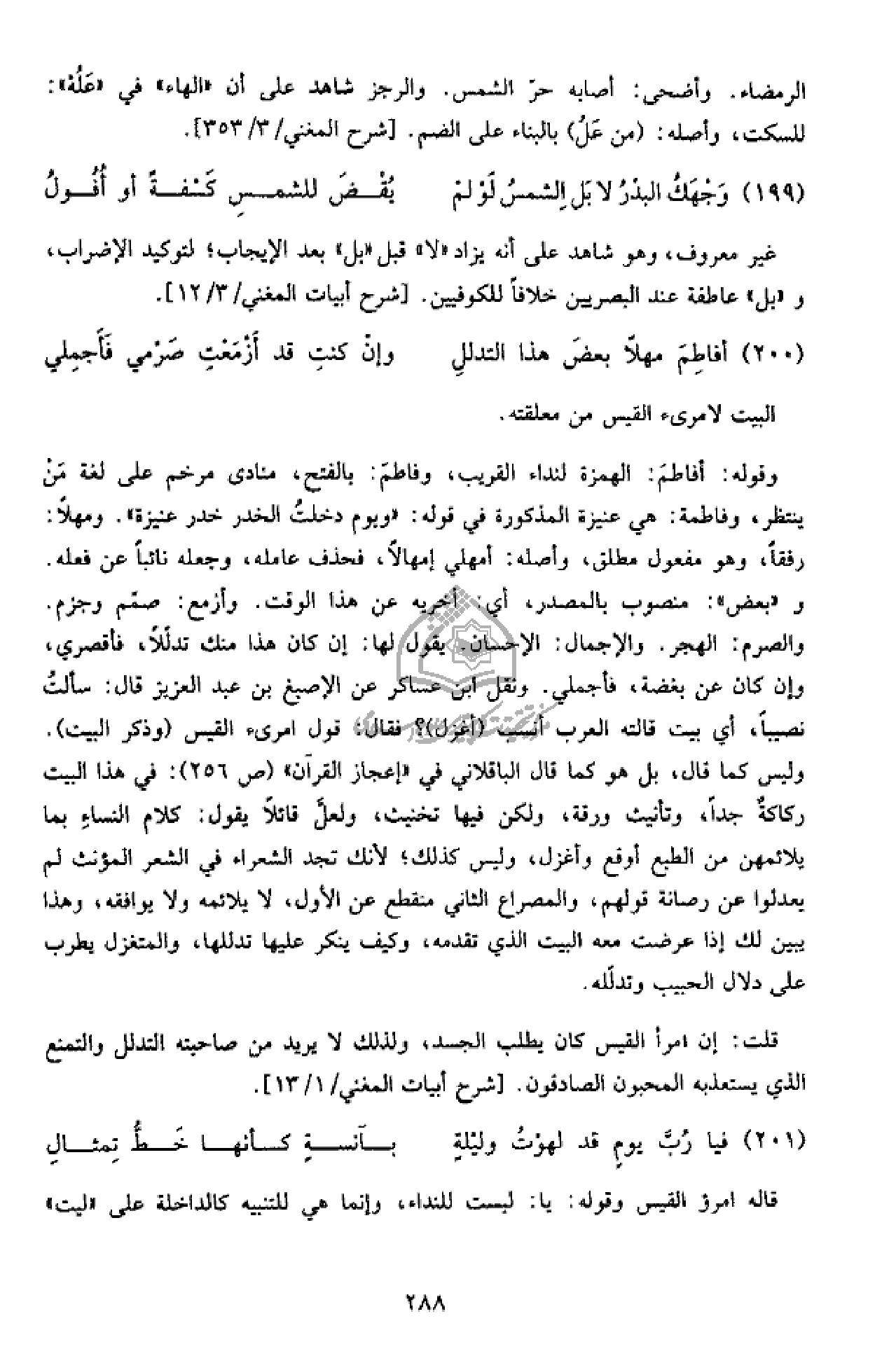 قلت: إن امرأ القيس كان يطلب الجسد، ولذلك لا يريد من صاحبته التدلل والتمنع الذي يستعذبه المحبون الصادقون. [شرح أبيات المغني/ 1/ 13].