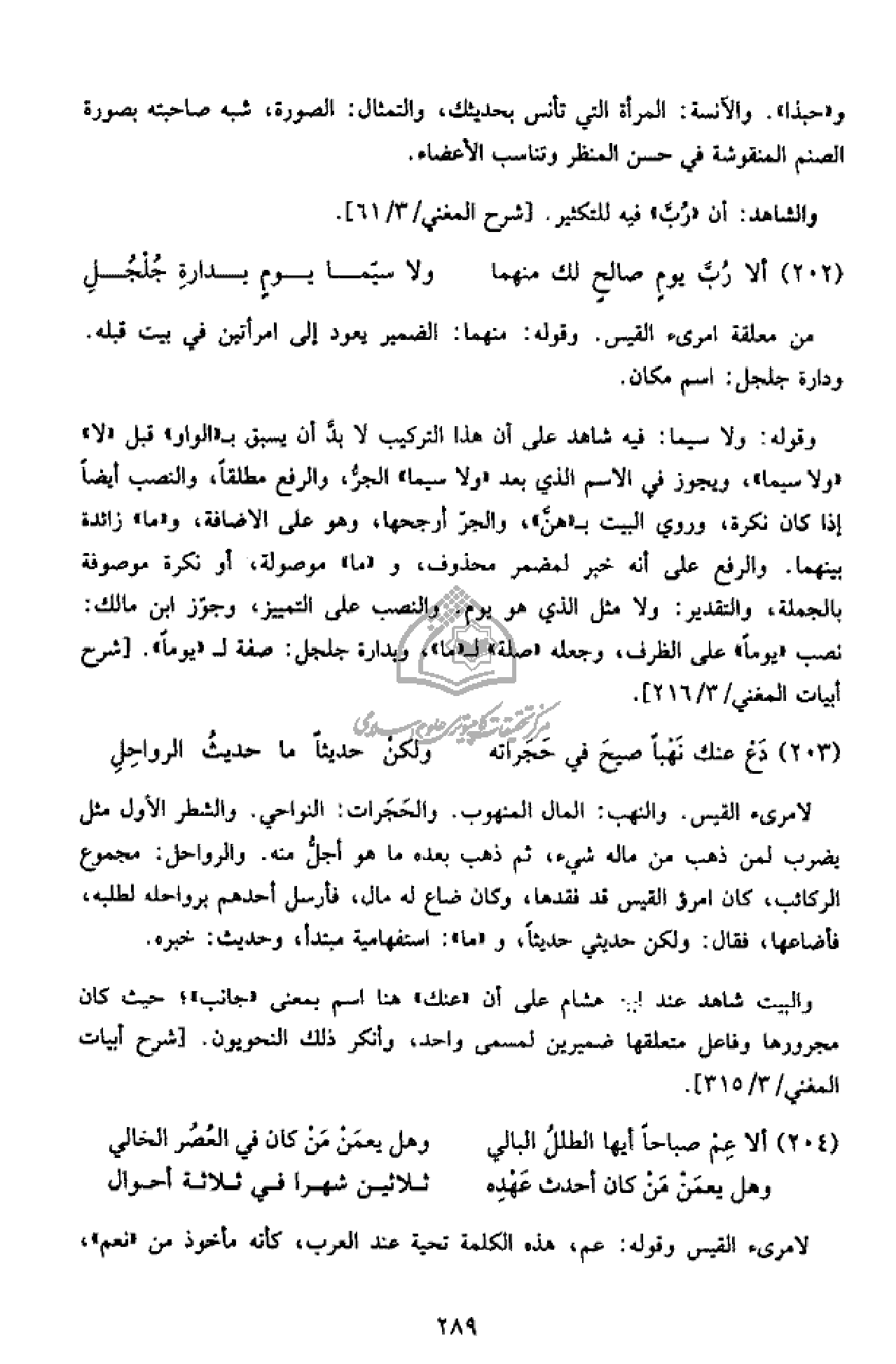 وقوله: ولا سيما: فيه شاهد على أن هذا التركيب لا بدّ أن يسبق ب «الواو» قبل «لا» «ولا سيما»، ويجوز في الاسم الذي بعد «ولا سيما» الجرّ، والرفع مطلقا، والنصب أيضا إذا كان نكرة، وروي البيت ب «هنّ»، والجرّ أرجحها، وهو على الاضافة، و «ما» زائدة بينهما. والرفع على أنه خبر لمضمر محذوف، و «ما» موصولة، أو نكرة موصوفة بالجملة، والتقدير: ولا مثل الذي هو يوم. والنصب على التمييز، وجوّز ابن مالك: