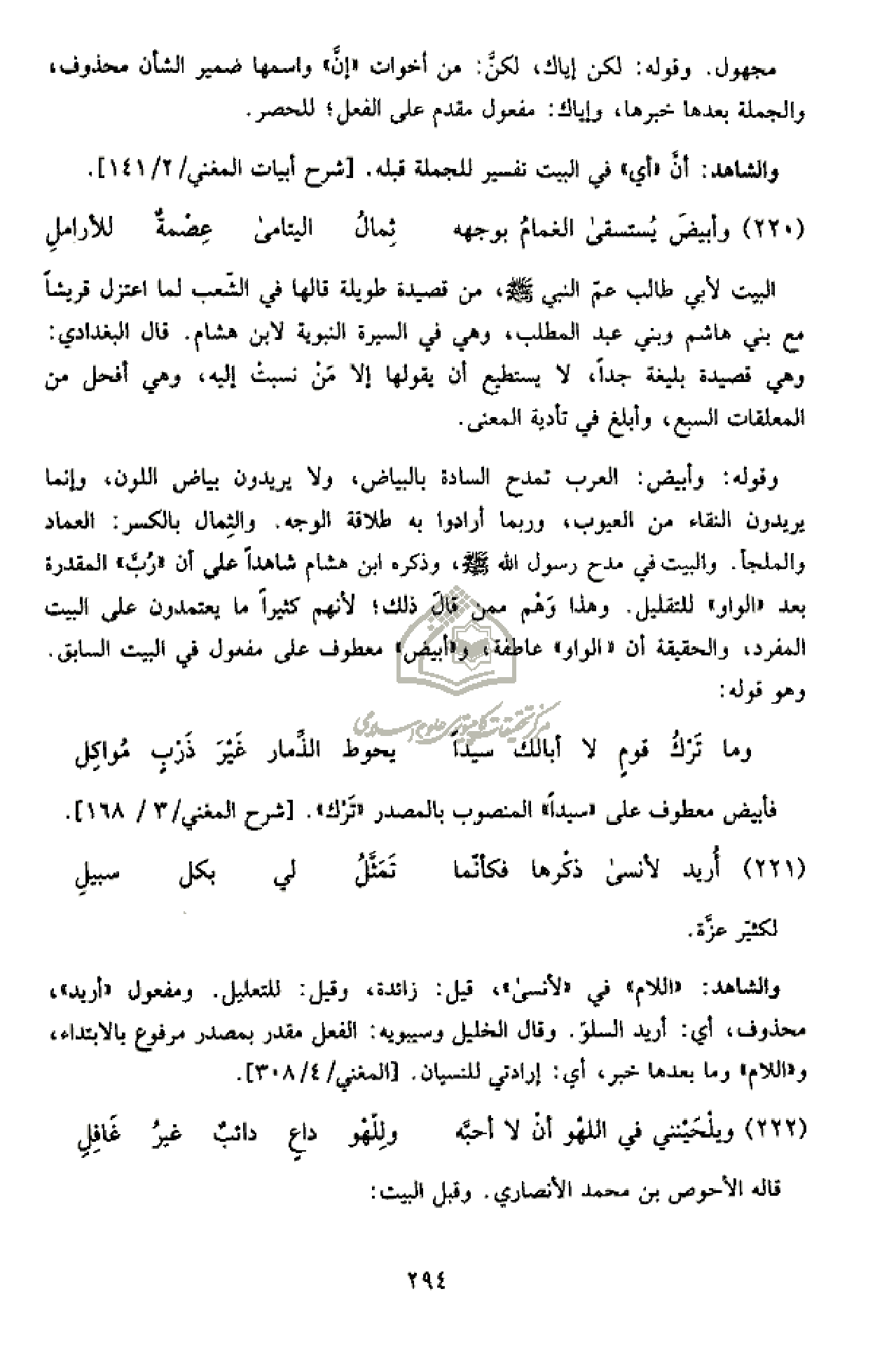 والشاهد: «اللام» في «لأنسى»، قيل: زائدة، وقيل: للتعليل. ومفعول «أريد»، محذوف، أي: أريد السلوّ. وقال الخليل وسيبويه: الفعل مقدر بمصدر مرفوع بالابتداء، و «اللام» وما بعدها خبر، أي: إرادتي للنسيان. [المغني/ 4/ 308].