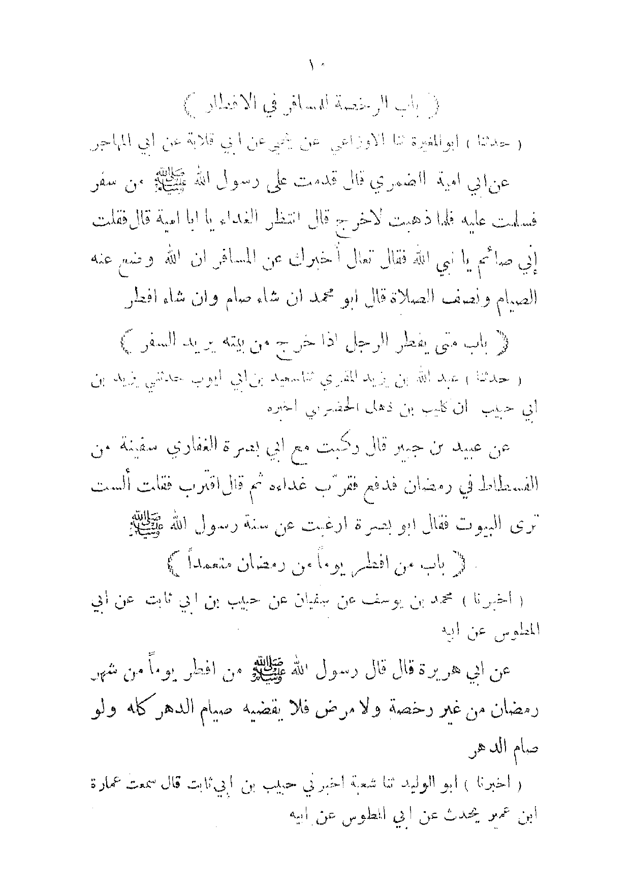 (حدثنا) عبد الله بن يزيد المقري ثنا سعيد بن أبي أيوب حدثني يزيد بن أبي حبيب أن كليب بن ذهل الحضرمي أخبره عن عبيد بن جبير قال ركبت مع أبي بصرة الغفاري سفينة من الفسطاط في رمضان فدفع فقرب غداءه ثم قال اقترب فقلت ألست ترى البيوت فقال أبو بصرة ارغبت عن سنة رسول الله صلى الله عليه وسلم