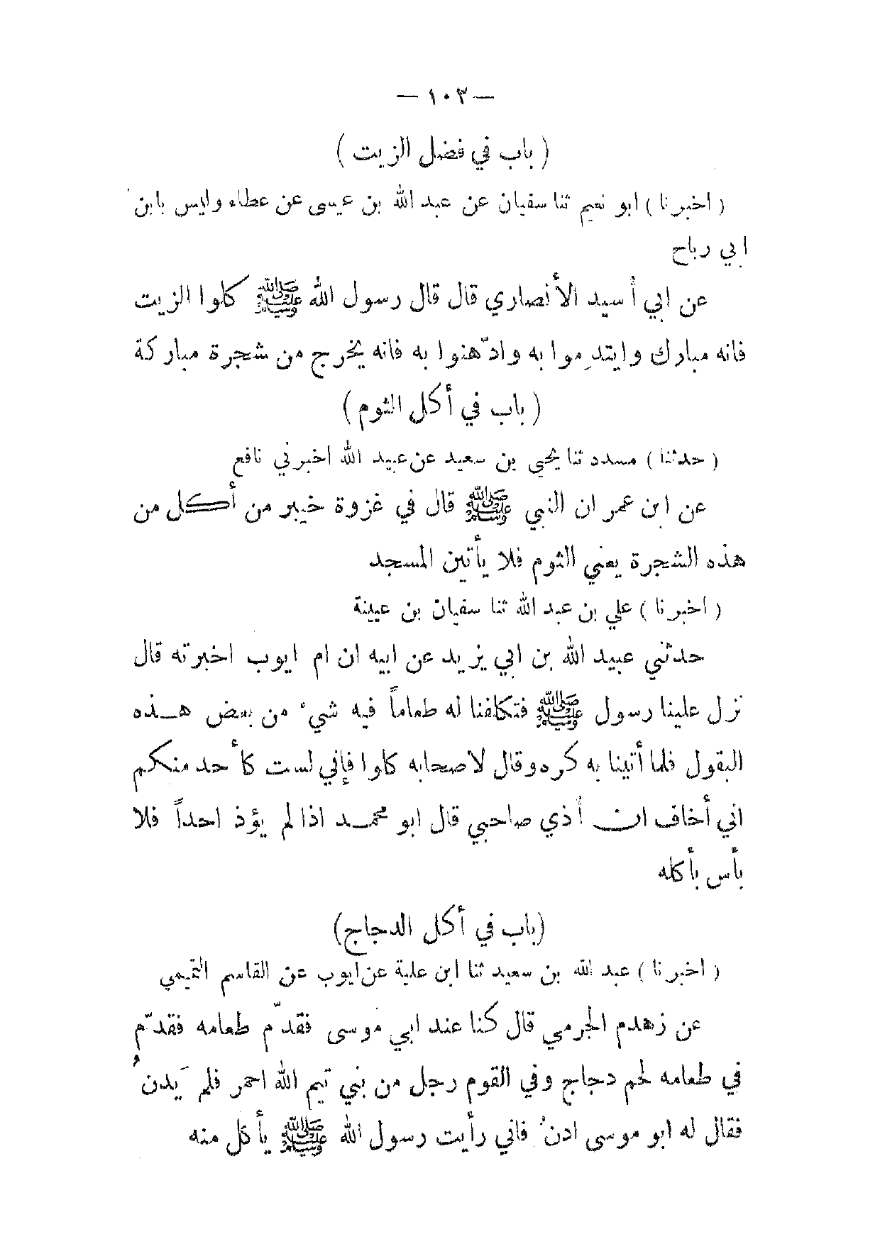 (أخبرنا) علي بن عبد الله ثنا سفيان بن عيينة حدثني عبيدالله بن ابي يزيد عن ابيه ان ام ايوب اخبرته قال نزل علينا رسول صلى الله عليه وسلم فتكلفنا له طعاما فيه شئ من بعض هذه البقول فلما أتينا به كره وقال لاصحابه كلوا فإني لست كأحد منكم اني أخاف ان أذي صاحبي قال أبو محمد إذا لم يؤذ احدا فلا بأس بأكله