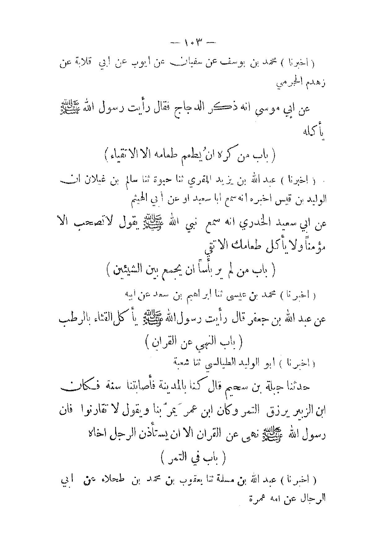 (أخبرنا) محمد بن عيسى ثنا ابراهيم بن سعد عن ابيه عن عبد الله بن جعفر قال رأيت رسول الله صلى الله عليه وسلم يأكل القثاء بالرطب